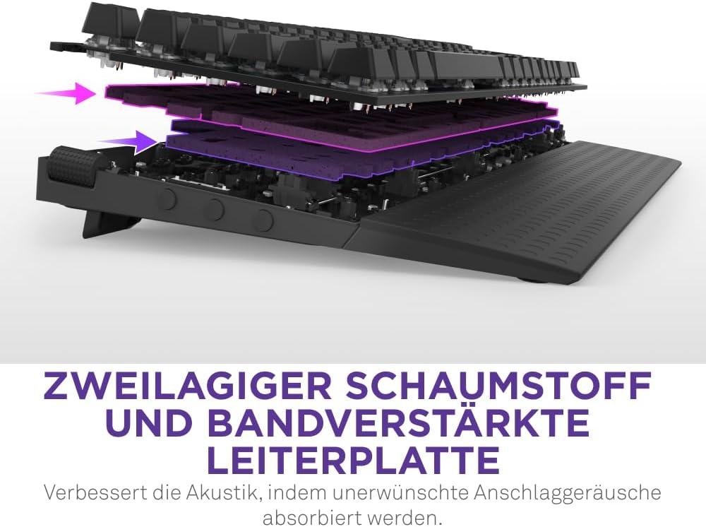 • КОМФОРТ ПО ЗВУК И УСЕЩАНЕ - Звукопоглъщащата пяна и подсилената с лента печатна платка създават дълбока, пълна акустика, докато конструкцията с уплътнение осигурява меко и омекотено изживяване при писане.