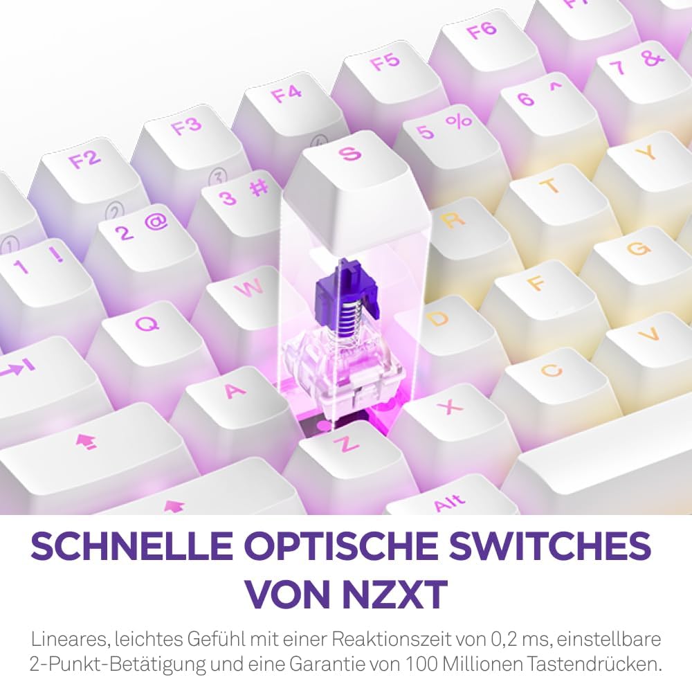 NZXT Function 2 MiniTKL - 2024 Оптична геймърска клавиатура без клавиши, RGB осветена, 8K скорост на заявки, линейни оптически превключватели, регулируем спусък, възможност за гореща смяна, бяла, UK (QWERTY)