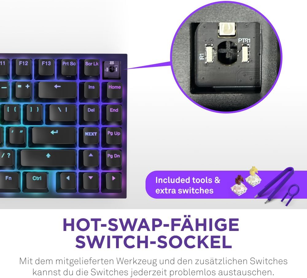 NZXT Function 2 MiniTKL - 2024 Оптична геймърска клавиатура без клавиши, RGB осветена, 8K скорост на заявки, линейни оптически превключватели, регулируем спусък, възможност за гореща смяна, черна DE (QWERTZ)