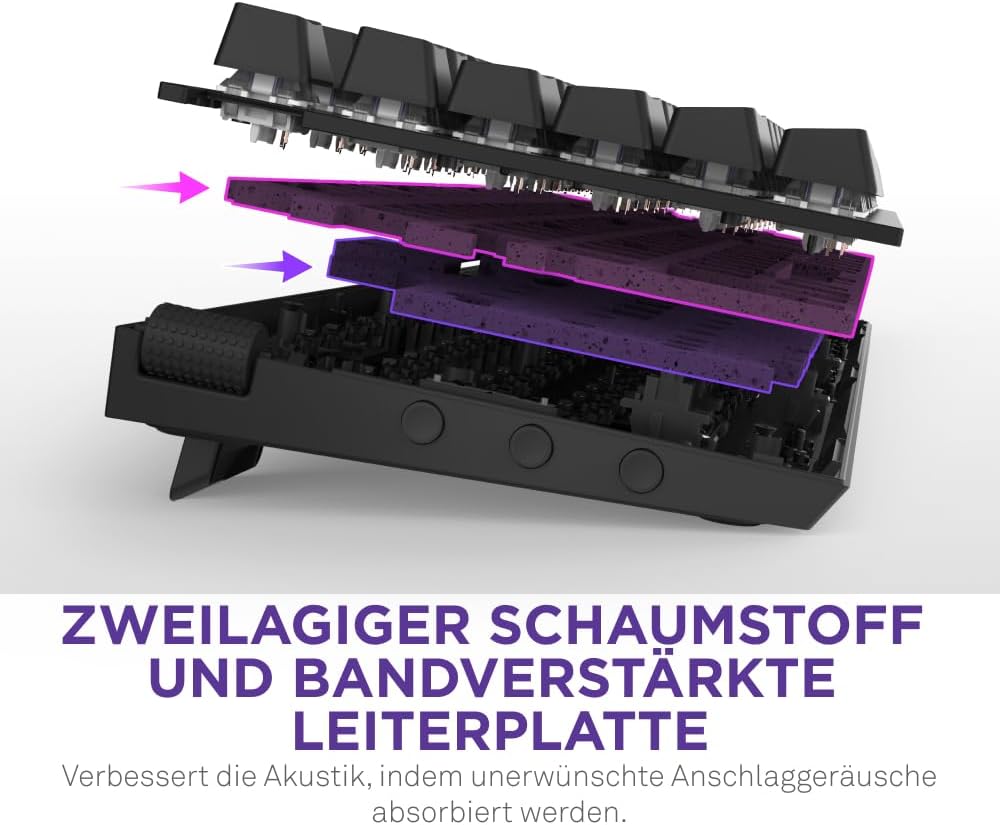 • КОМФОРТ ПО ЗВУК И УСЕЩАНЕ - Звукопоглъщащата пяна и подсилената с лента печатна платка създават дълбока, пълна акустика, докато конструкцията с уплътнение осигурява меко и омекотено изживяване при писане.