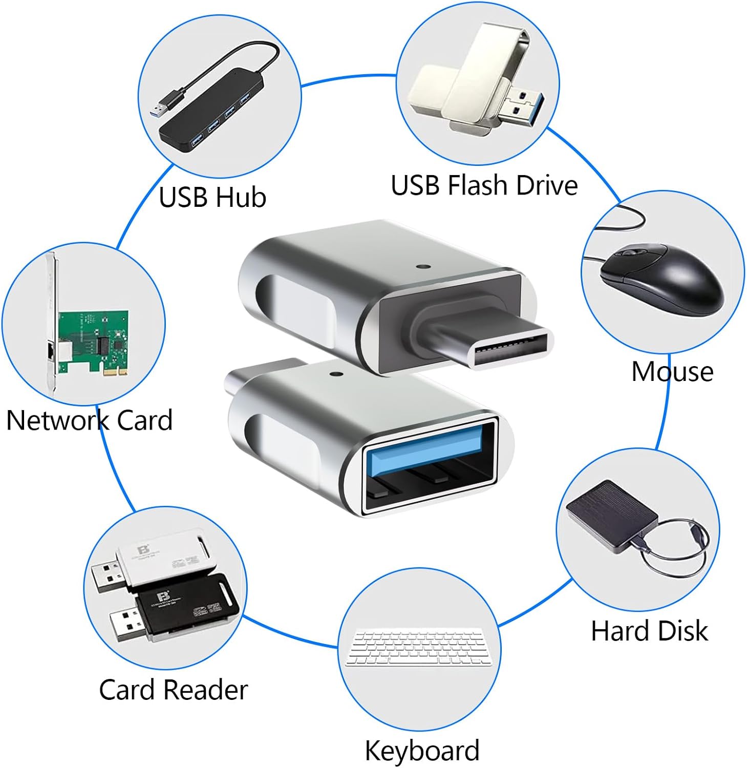 • USB C към USB адаптер Това е USB към USB C OTG адаптер, който ви позволява да свържете повечето устройства с USB порт, като USB памет, мишка, клавиатура, геймпад, към вашите USB-C устройства и да прехвърляте данни. Например, свържете USB мишка към вашия MacBook или свържете USB паметта към мобилния си телефон и незабавно прехвърляйте снимки или видеоклипове.