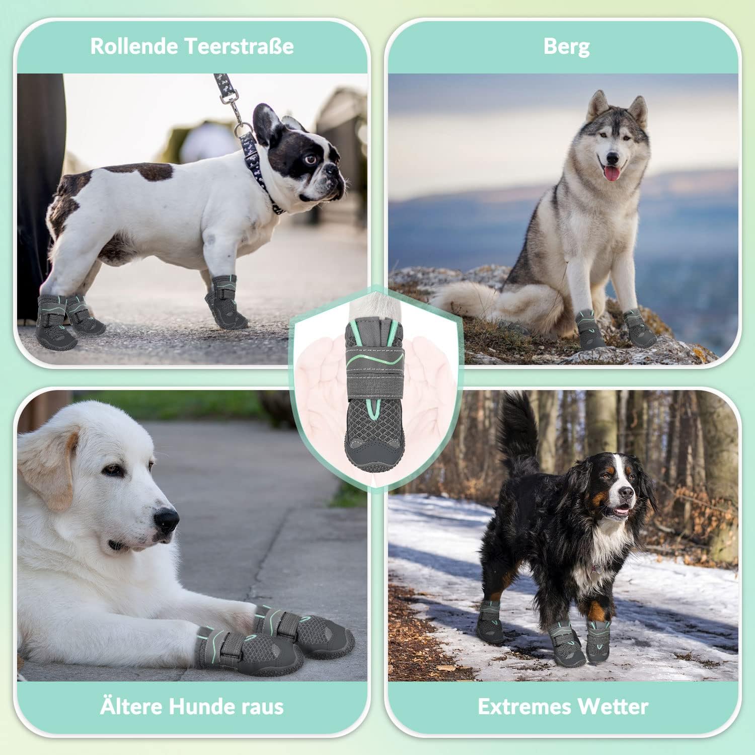 • Неплъзгаща се и издръжлива подметка: Неплъзгащият се дизайн на подметката осигурява отлична стабилност и сцепление за вашето куче. Меката гумена подметка и водоустойчивият кожен връх предпазват лапите на вашето куче от остри тръни, гореща настилка и едри частици сол в снежни дни.