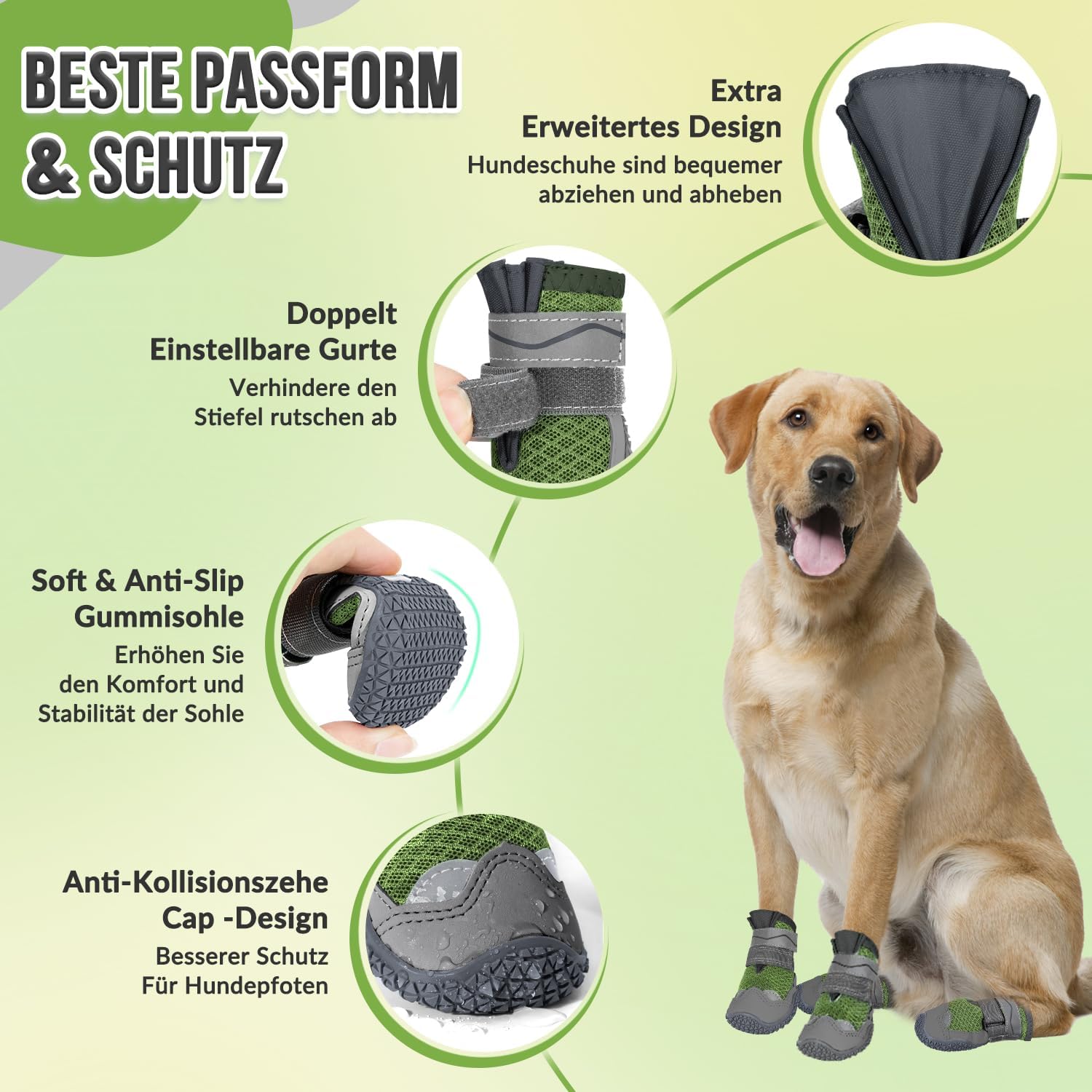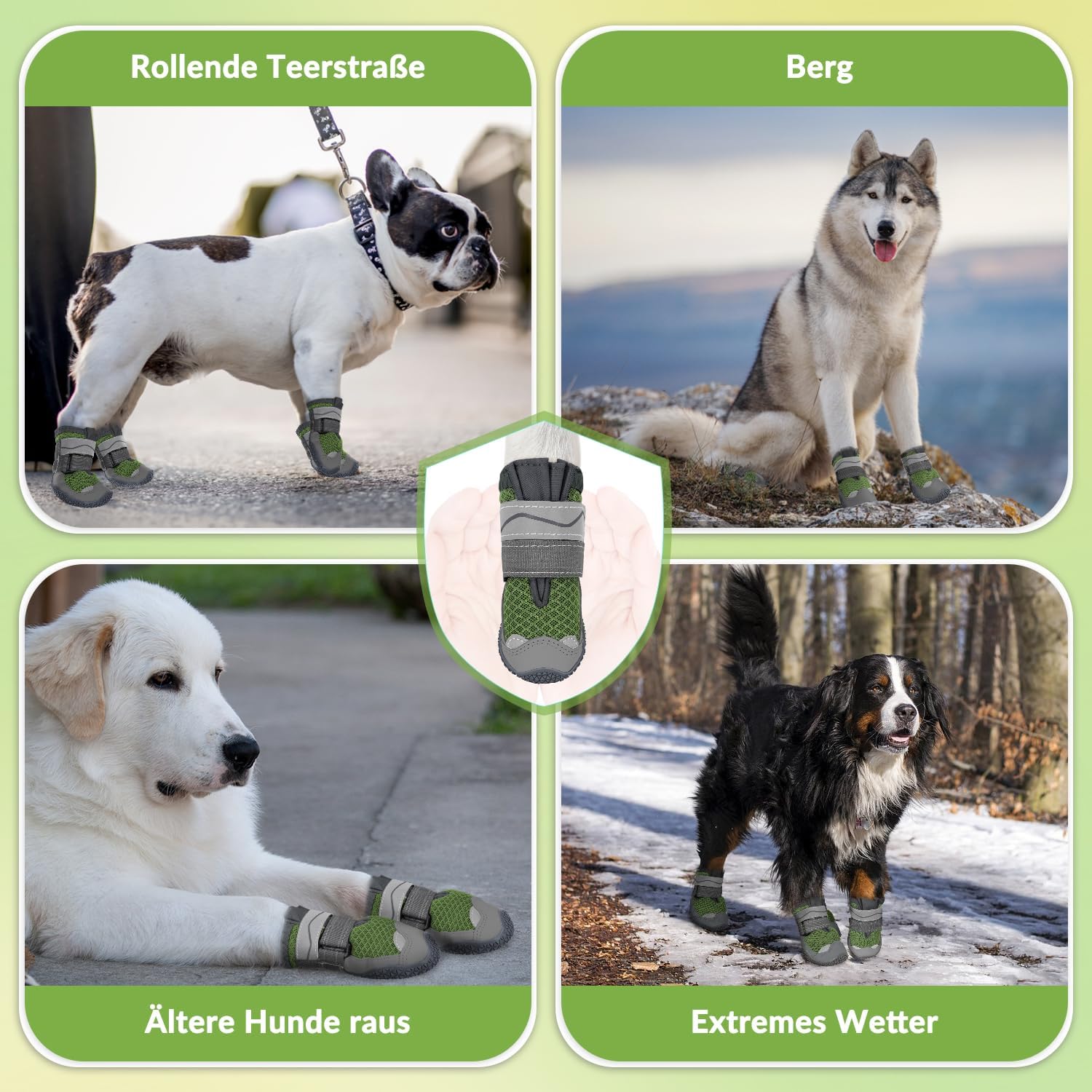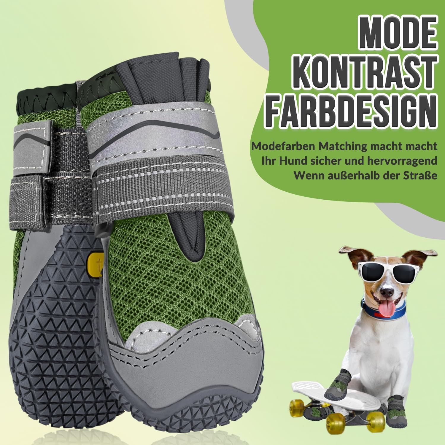 Обувки за кучета, Защита на лапите, Комплект от 4 дишащи обувки за кучета с нехлъзгаща се подметка и светлоотразително велкро закопчаване за малки, средни и големи кучета, Спортове на открито, Тъмнозелени, Размер 0