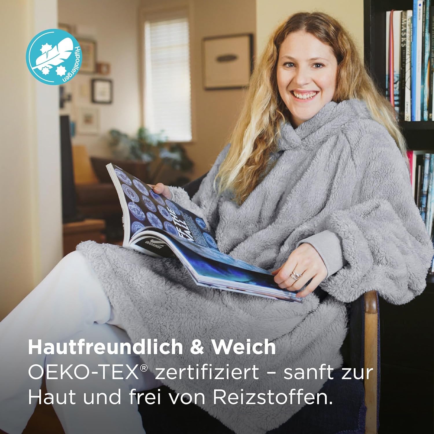 Почувствайте топлината в студените есенни или зимни дни, като се увиете в нашето меко и удобно одеяло с ръкави. Не се притеснявайте, че одеялото ще падне от рамото ви с ръкавите. Независимо дали сте на дивана, пред телевизора или на бюрото, преносимото одеяло с практични ръкави е точното нещо за вас, без ръцете ви да замръзнат. Ако търсите супер меко и удобно за прегръщане одеяло за телевизор, тогава купете без колебание нашето меко одеяло Bedsure с ръкави XXL.