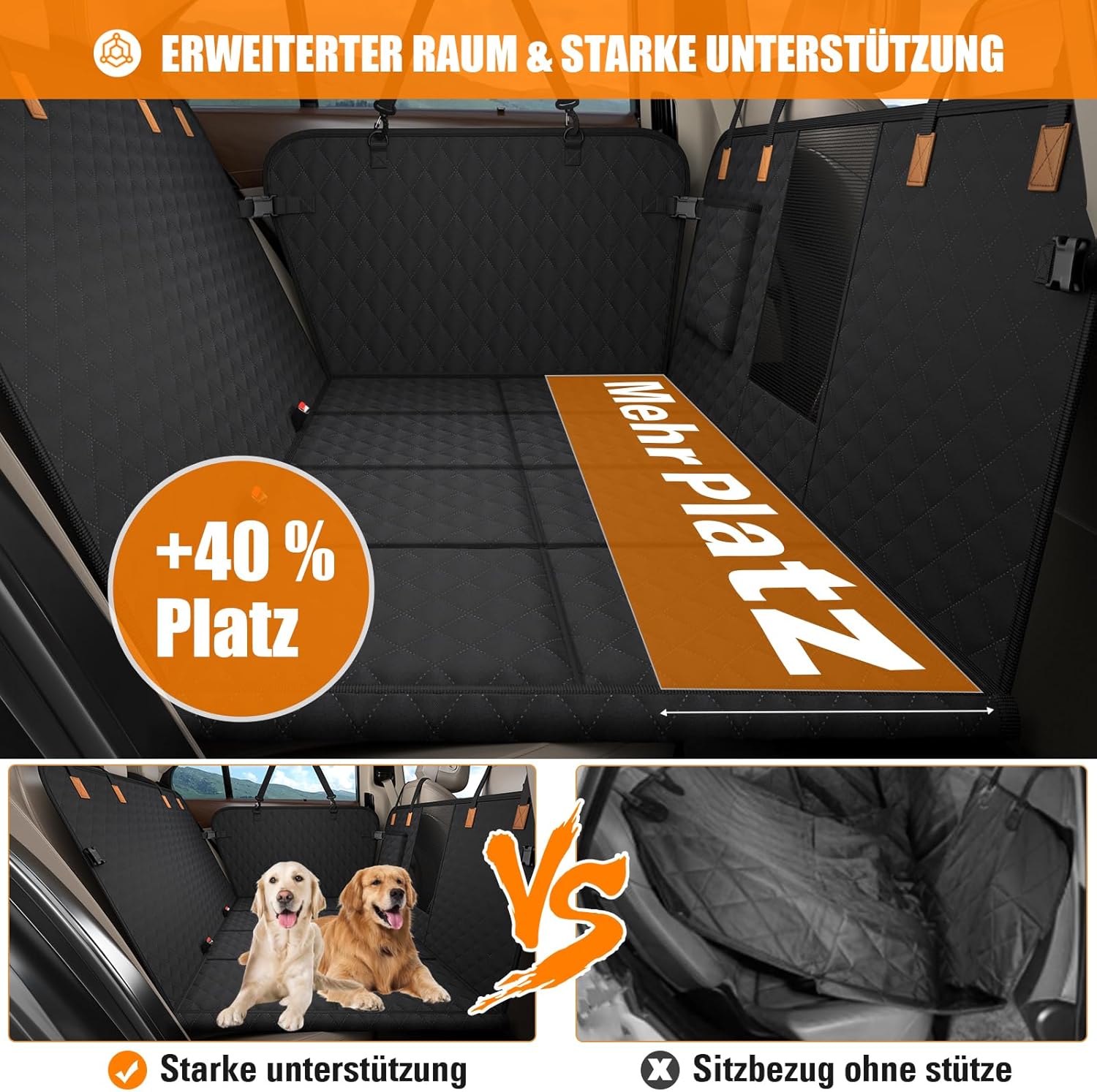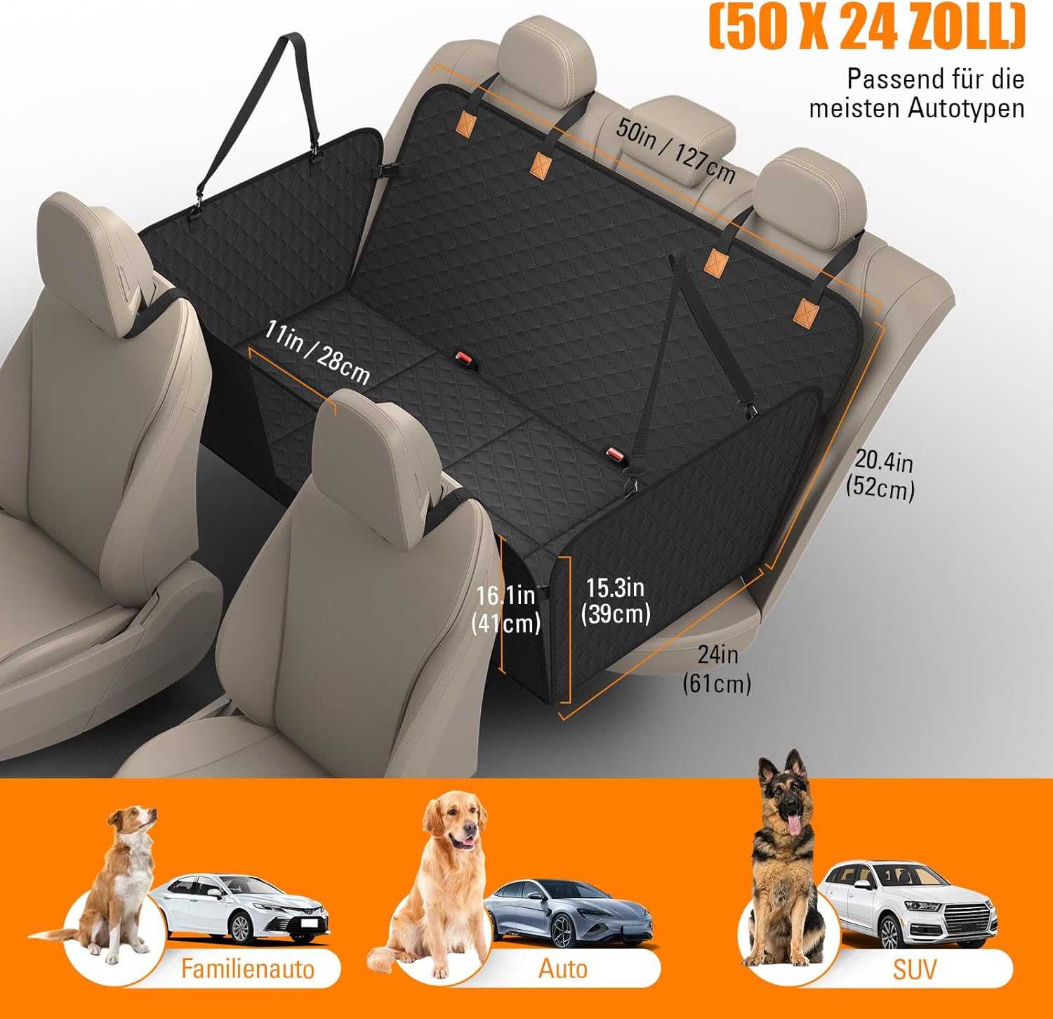• Изключително голямо и гъвкаво регулиране: покривалото за кола за кучета покрива цялата задна седалка (127 x 62 см) и предотвратява подхлъзване на кучетата в пространството за краката - идеално за големи кучета, домакинства с няколко кучета или пътуване с по-възрастни животни. Подходящо за SUV-ове, комбита и семейни автомобили като VW Golf, BMW 3 Series или Mercedes C-Class.