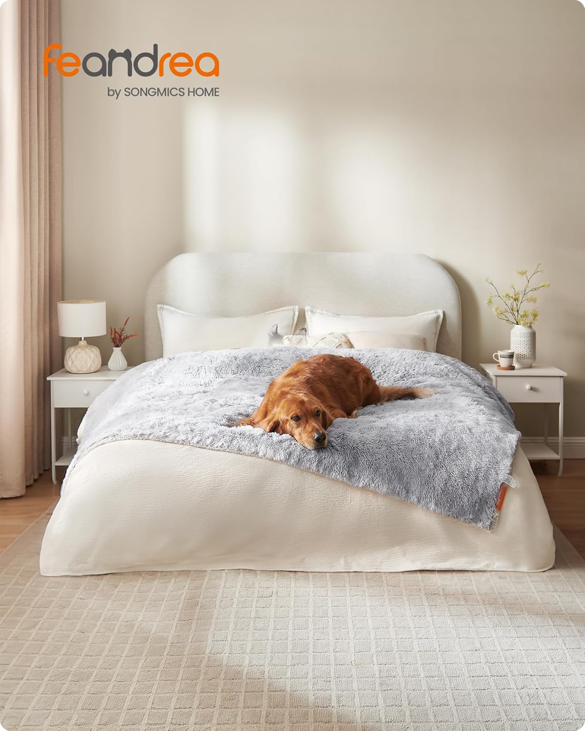 Одеяло за кучета Feandrea, водоустойчиво одеяло, дълго плюшено за големи, екстра големи кучета, котки, 203 x 152 см, XXL, шерпа плат, двулицево защитно одеяло за кучешки диван, омбре сиво PPB008G01