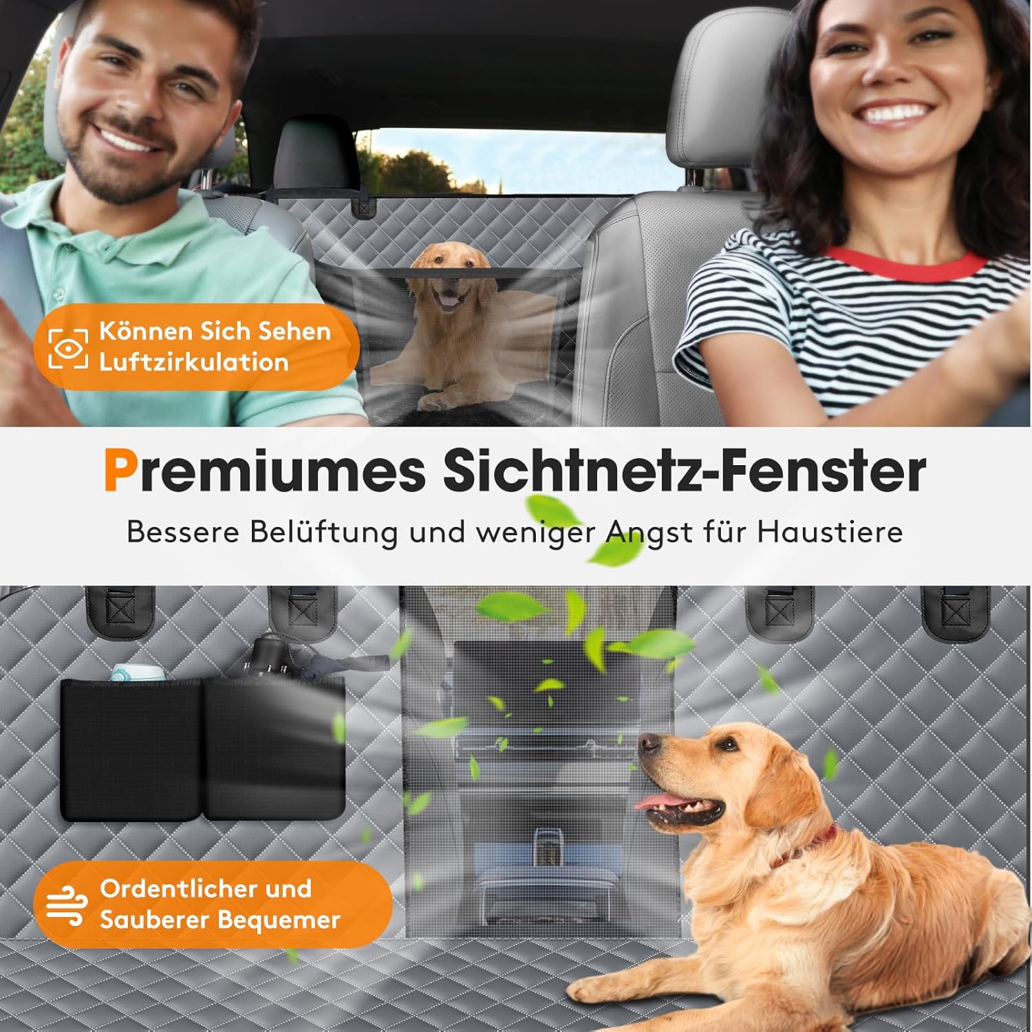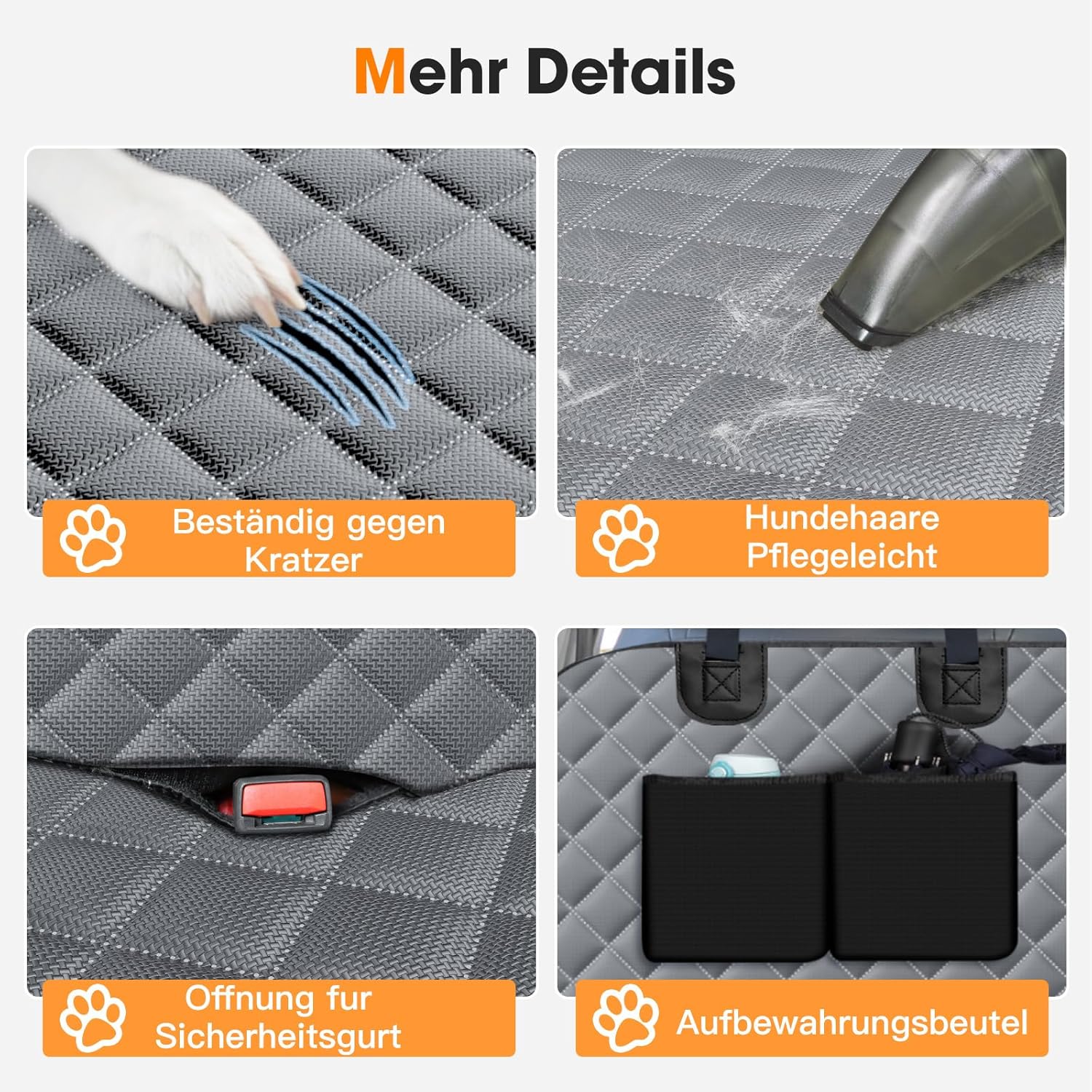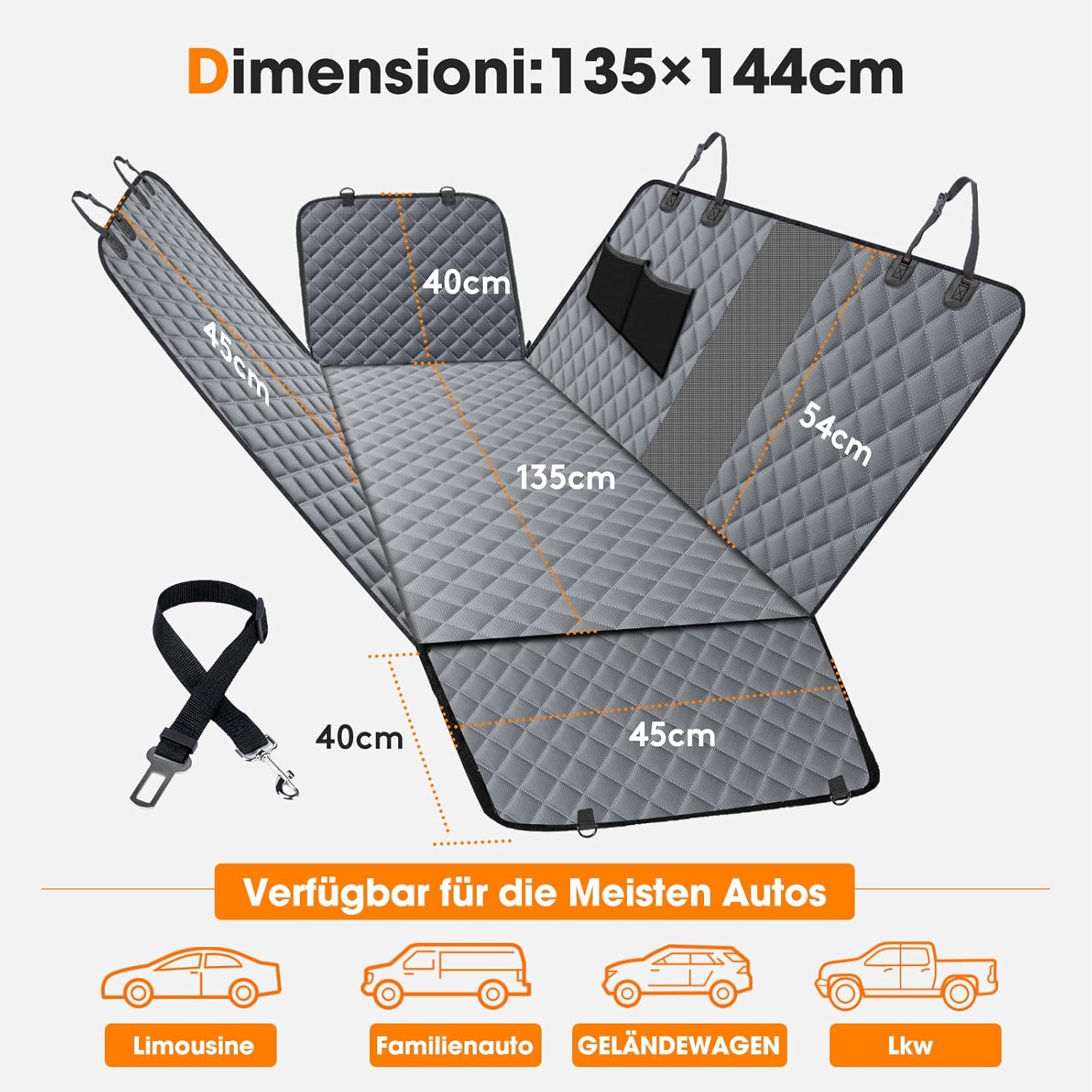 • 4-в-1 столче за кола за кучета: Нашата задна седалка за кола за защита на кучета е универсален аксесоар, който съчетава следните функции: 1. хамак за кучета, 2. покривало за пейка, 3. подложка за багажник, 4. постелка за къмпинг. Тя защитава цялостно цялата повърхност на задната седалка.
