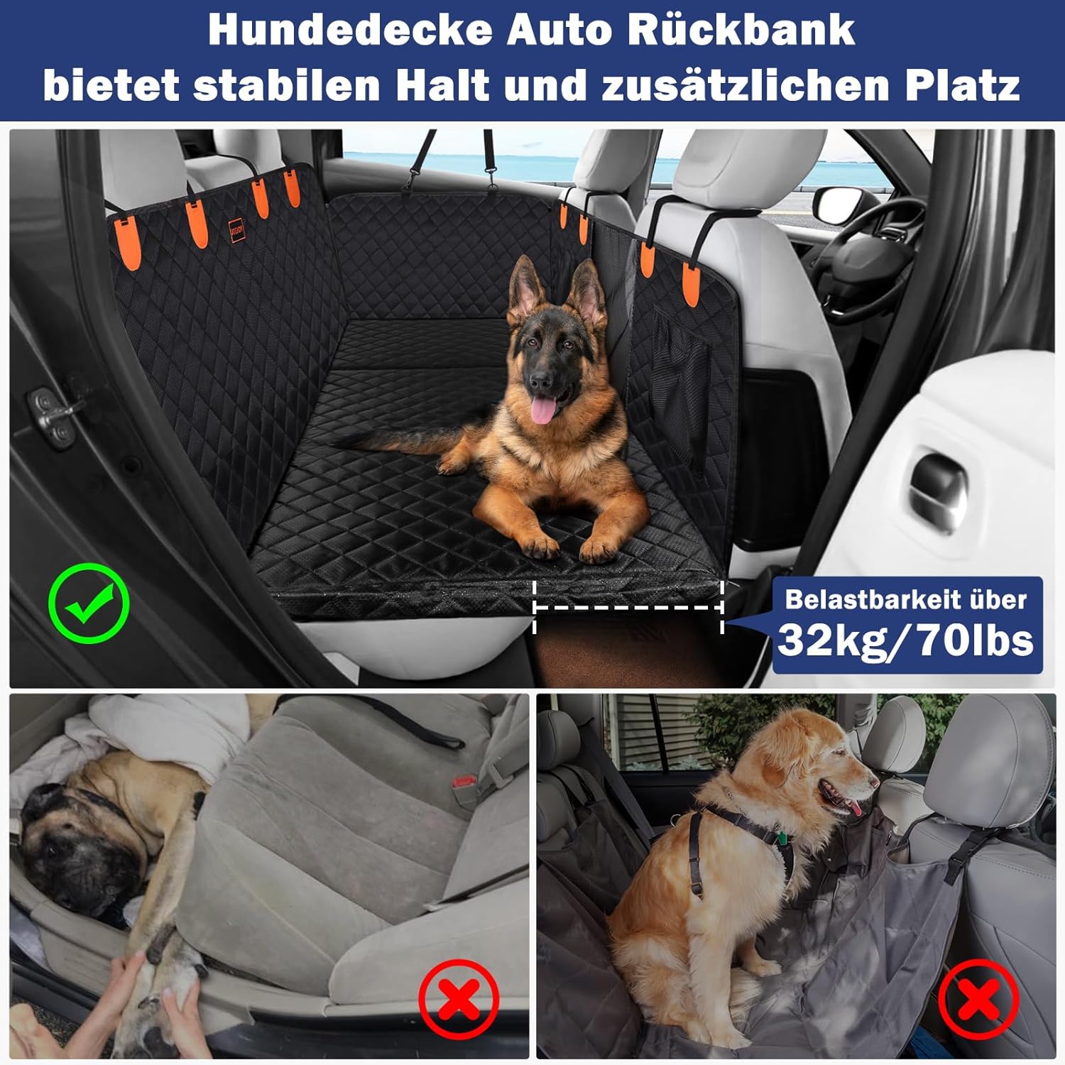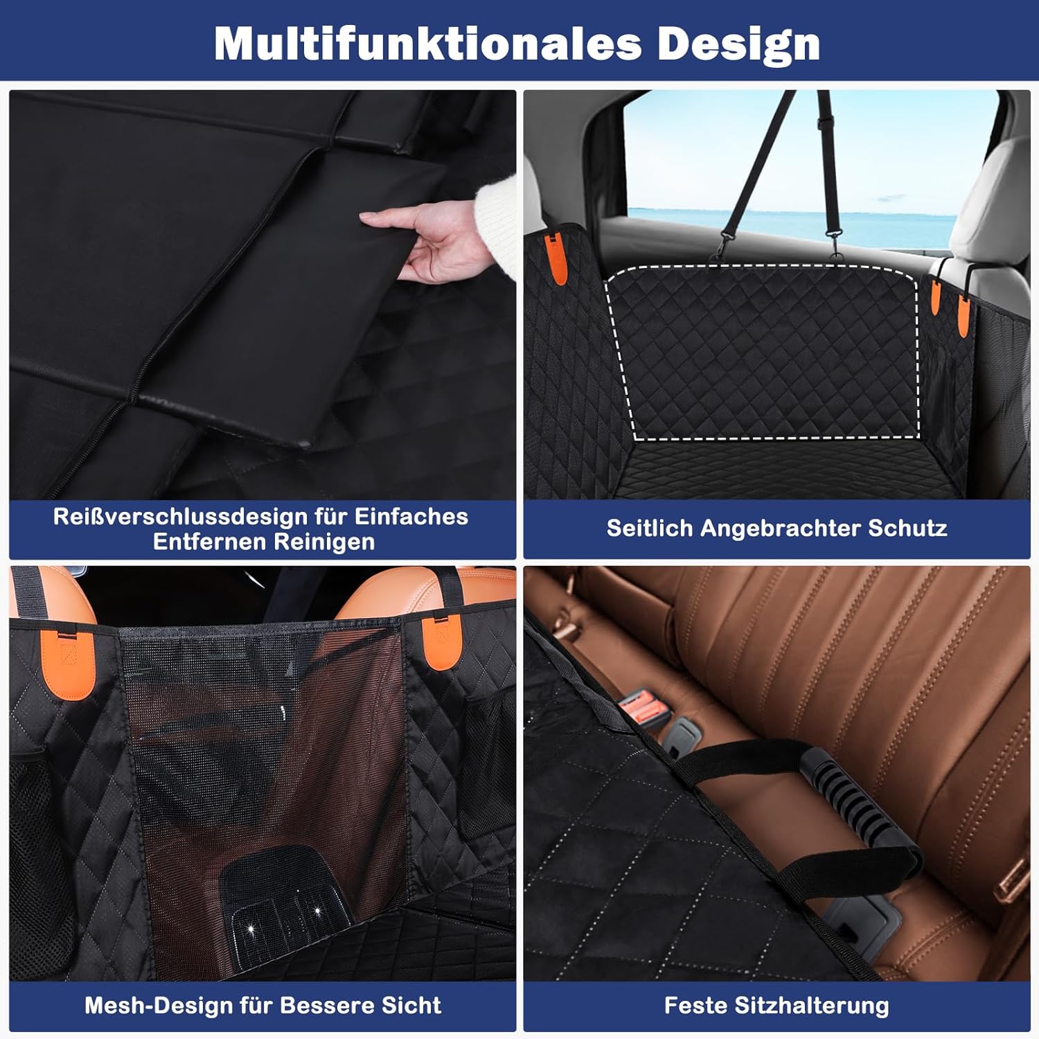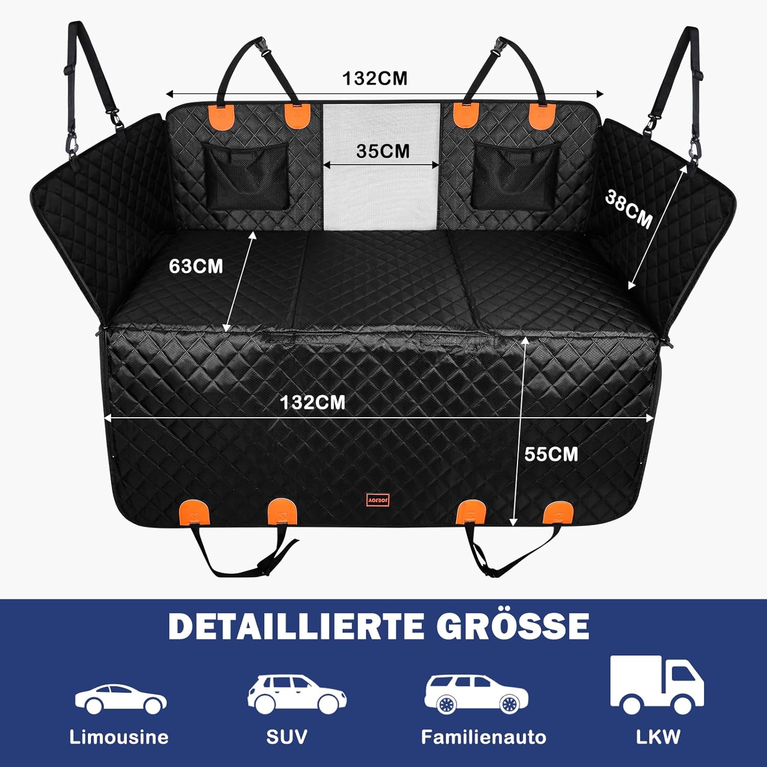 • Универсален размер и цялостна защита: калъфът за столче за кола е с размери 132 x 63 см - подходящ за повечето SUV-ове, камиони и семейни автомобили. Калъфът за столче за кола за кучета обхваща задната седалка и страните ѝ и предпазва цялото помещение от кал, мръсотия, косми, отпечатъци от лапи и др. Цялостната защита на задната седалка на автомобила предотвратява повреди по интериора на превозното средство, така че можете да пътувате с кучето си без притеснение. Голямата чанта за съхранение на хамака за кучета на задната седалка на автомобила може да се използва за съхранение на аксесоари за домашни любимци.