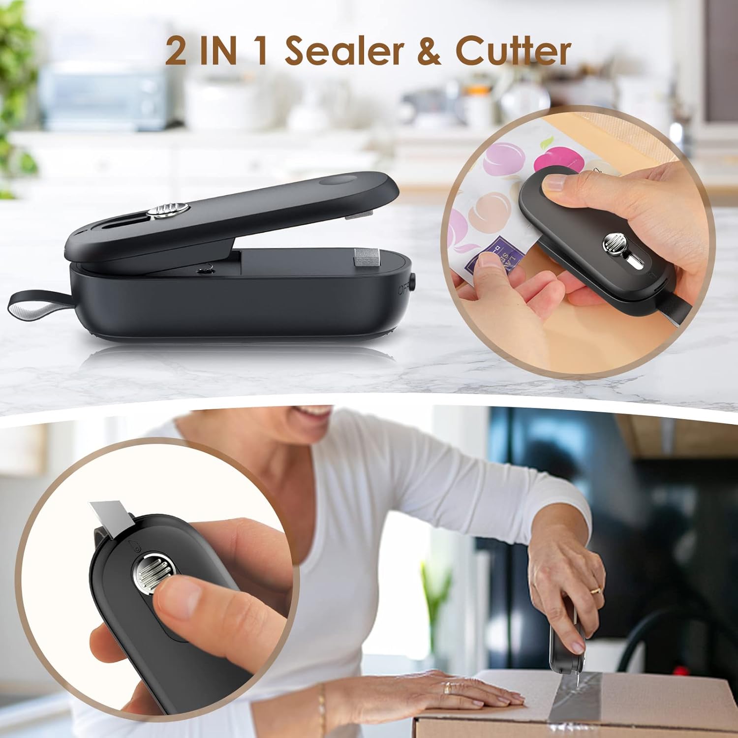 ODSD Мини фолио запечатка 2 в 1, запечатваща машина за торбички с нож, запечатваща машина, ръчно запечатващо устройство за пластмасови торбички, торбички за чипс, съхранение на храна, закуски (черна)