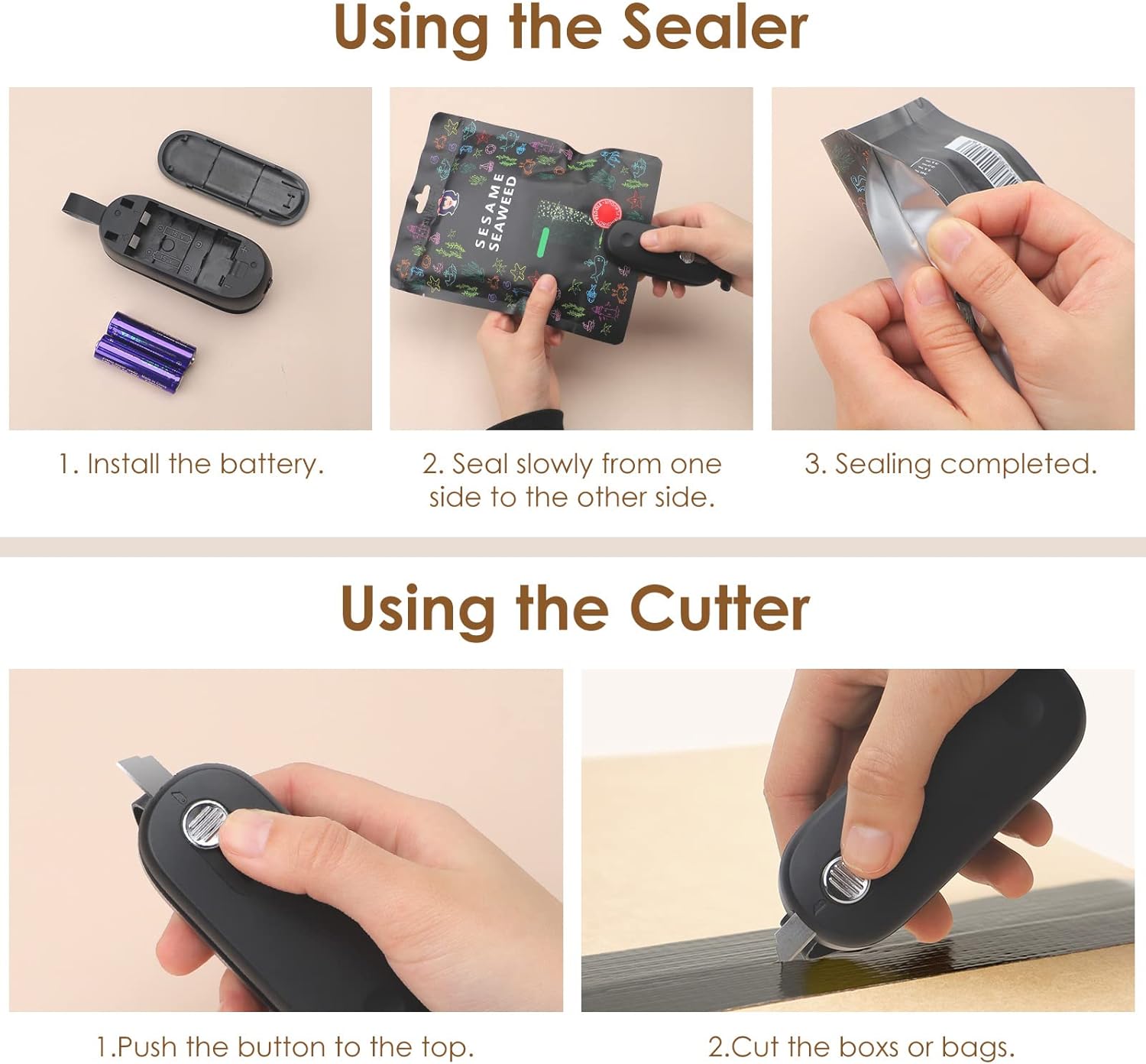 • 2 в 1: Мини апаратът за заваряване на фолио комбинира функции за запечатване и рязане в едно. Една глава за запечатване, една глава за рязане. (Батериите са включени)