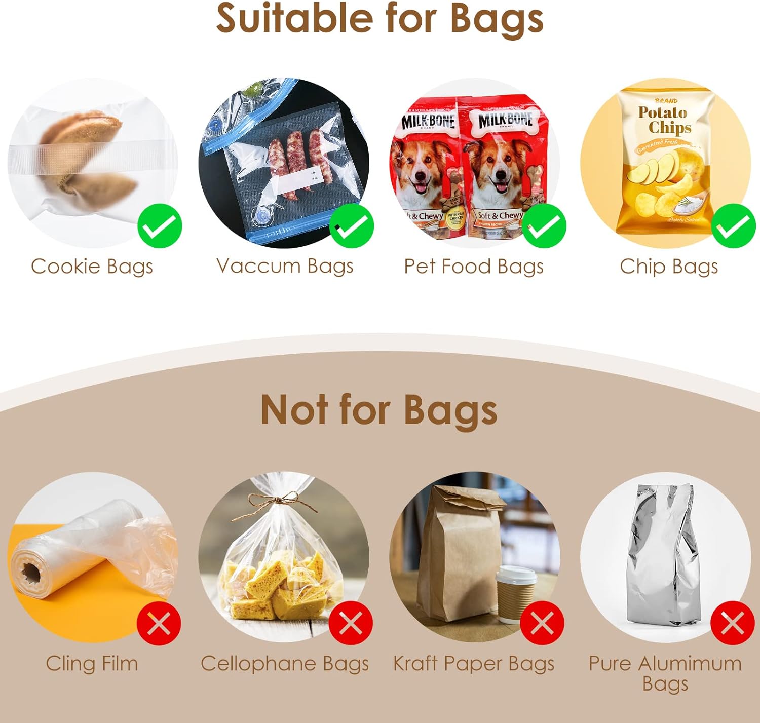 • Лесна употреба: Използвайте машината за термозапечатване на чипс/пликчета за закуски, когато не можете да ги изядете или ако искате да изядете само част от храната. Елате на място, след като децата са отворили закуската и не искат да я ядат. Просто я запечатайте за по-късно, а също така има и нож за отваряне.