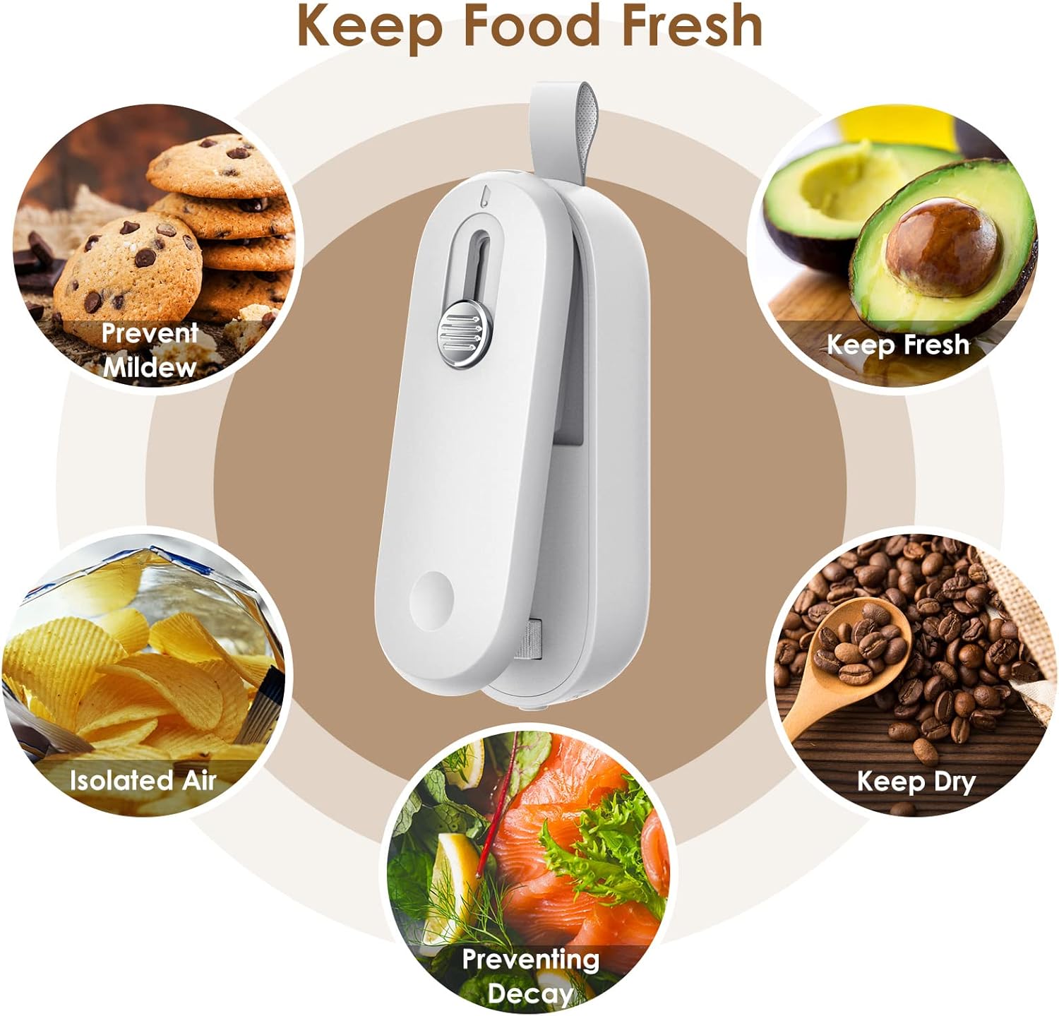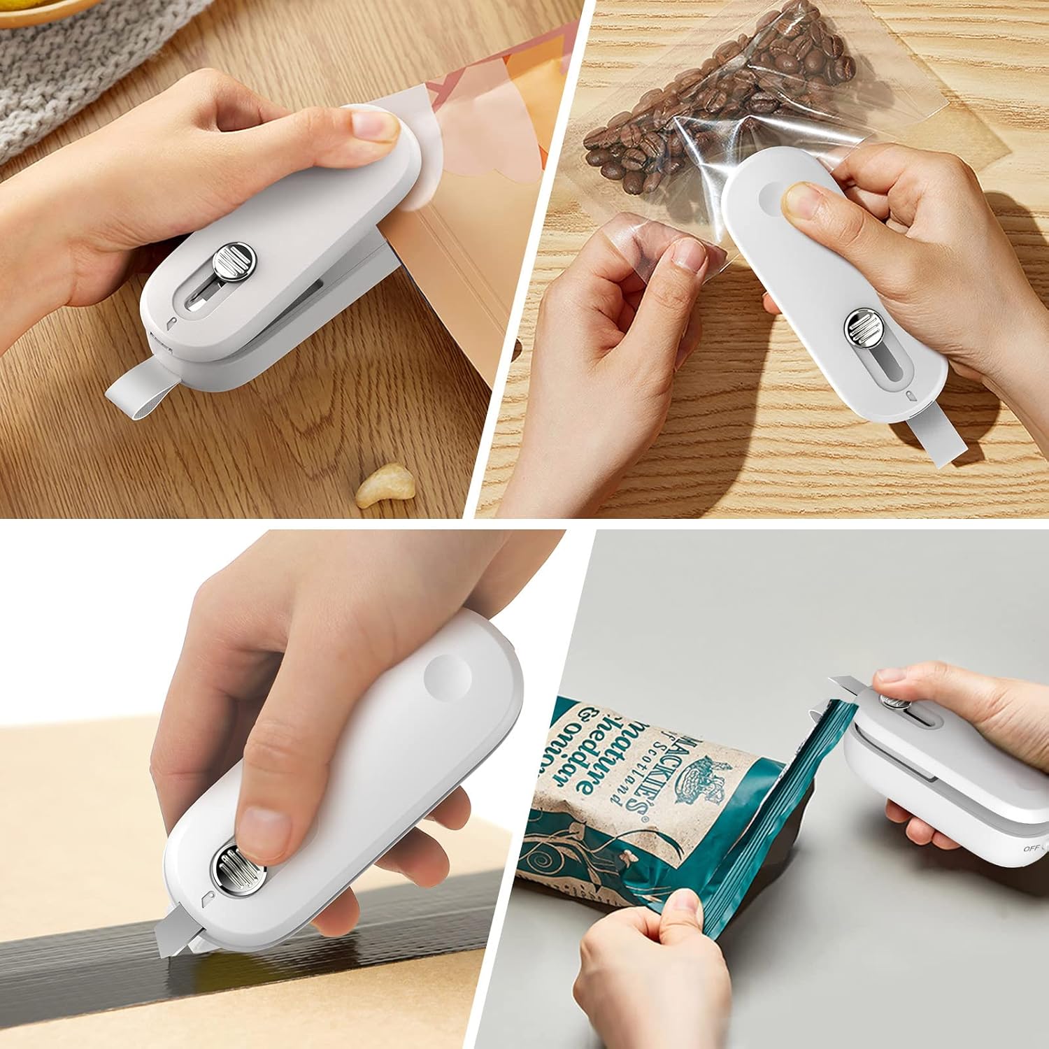 ODSD Мини фолио запечатваща машина 2 в 1 за торбички с нож запечатваща машина, ръчно запечатващо устройство за пластмасови торбички, торбички за чипс, съхранение на храна, закуски (бяла)