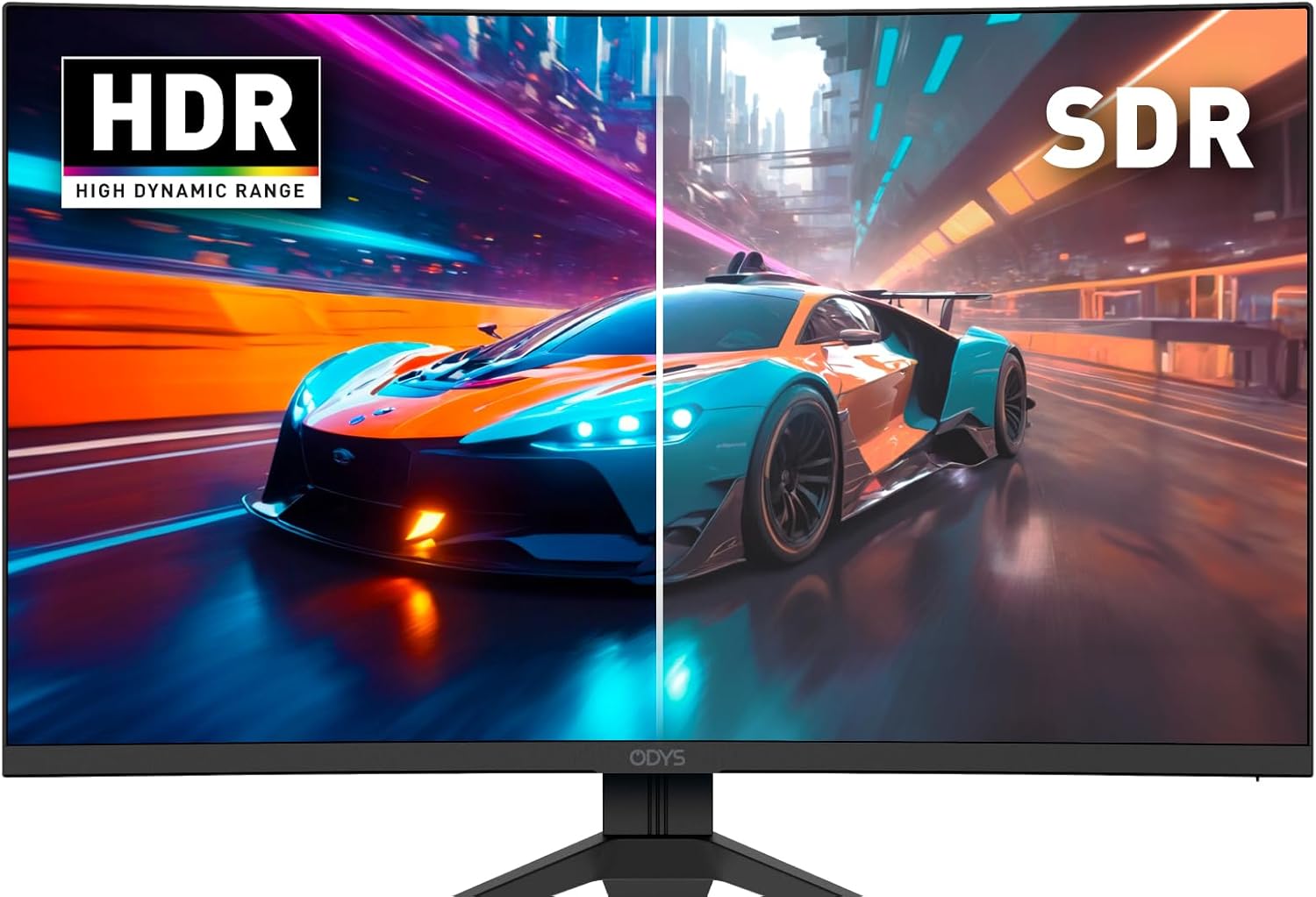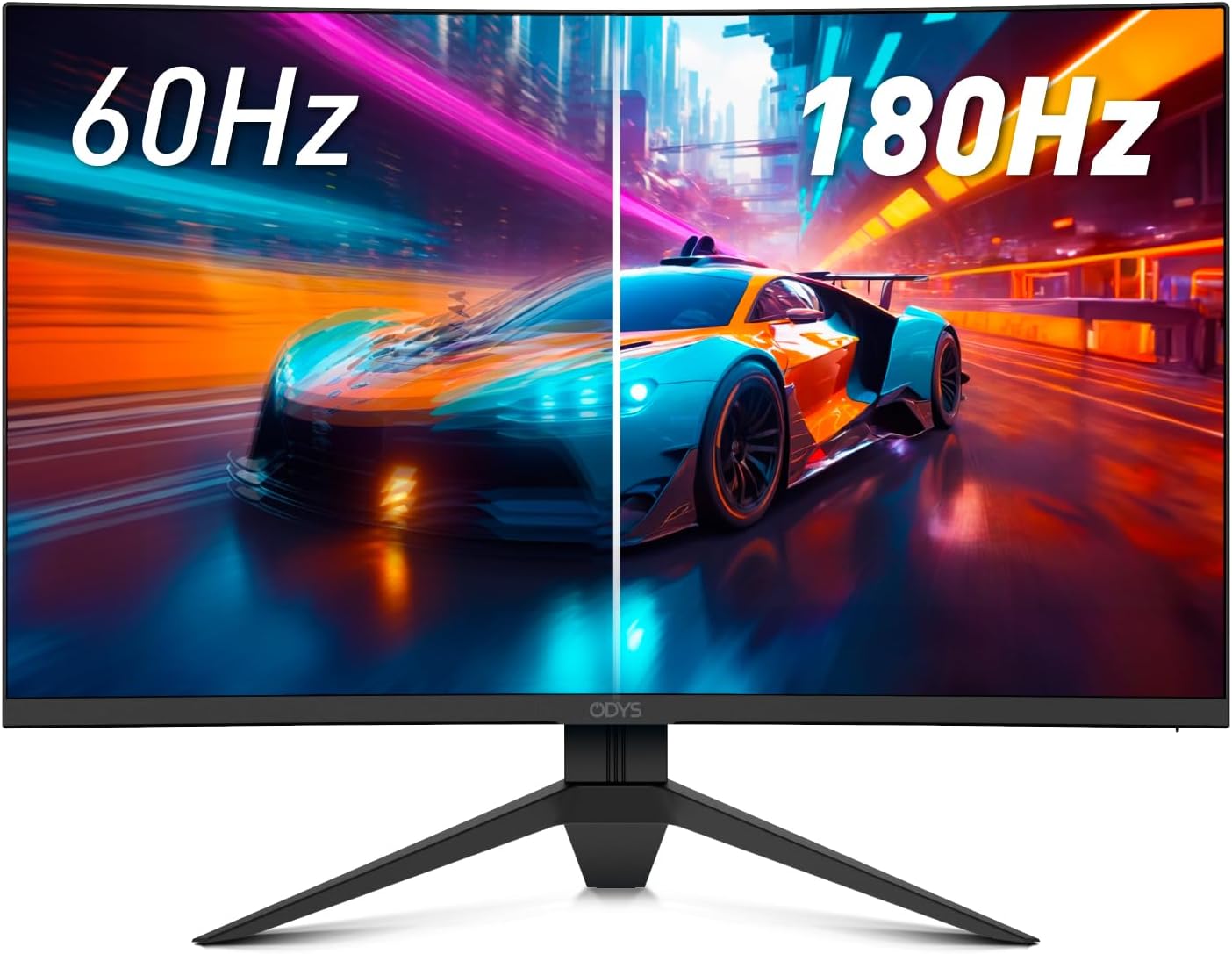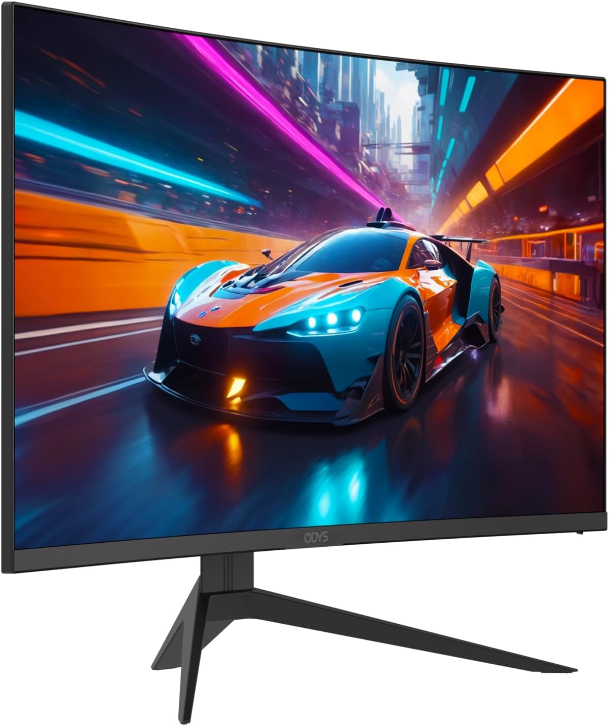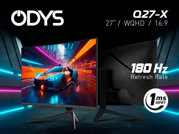 ODYS Геймърски монитор Q27-X - 27 инча (69 см), извит (1500R), 180 Hz, WQHD (2560 x 1440 px), време за реакция 1 ms (MPRT), HDR, FreeSync/G-Sync компенсация, Eye Care, HDMI, DP, 3.5 мм аудио
