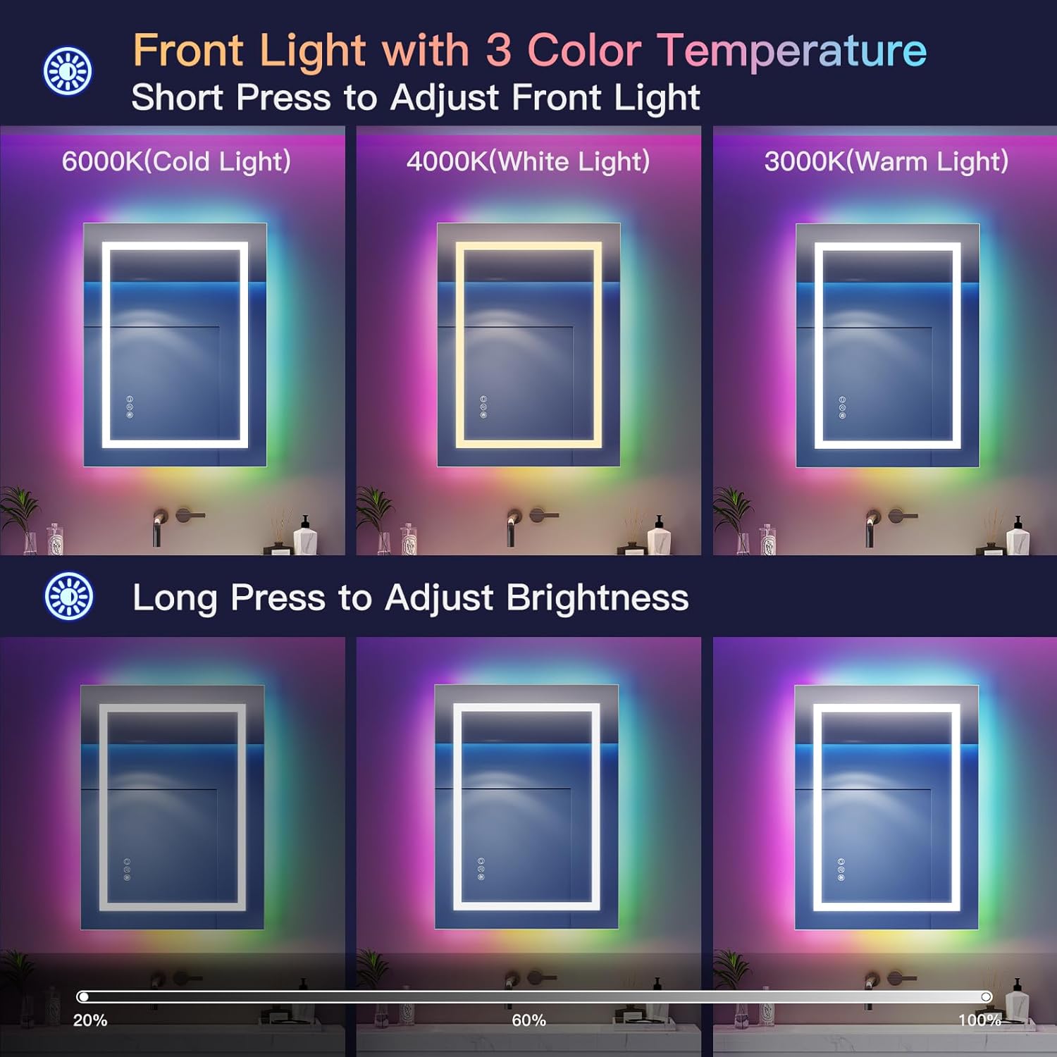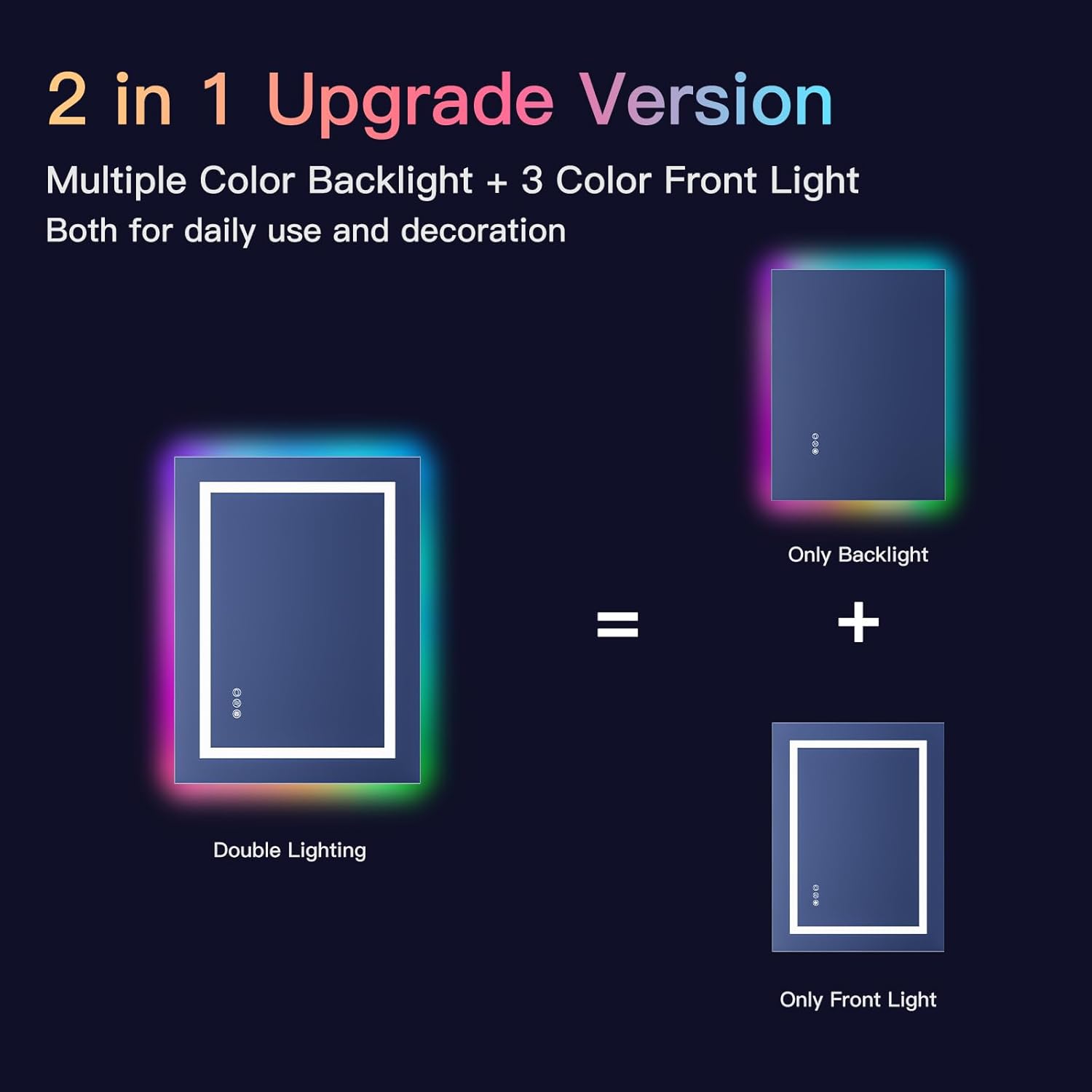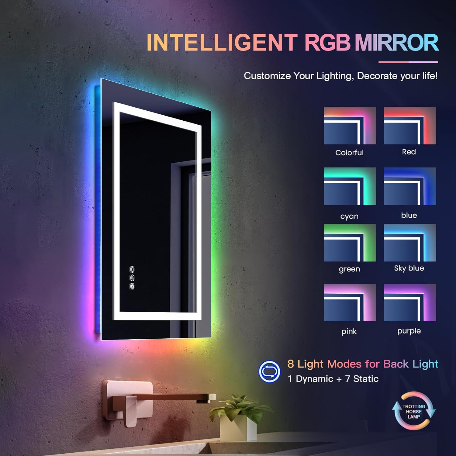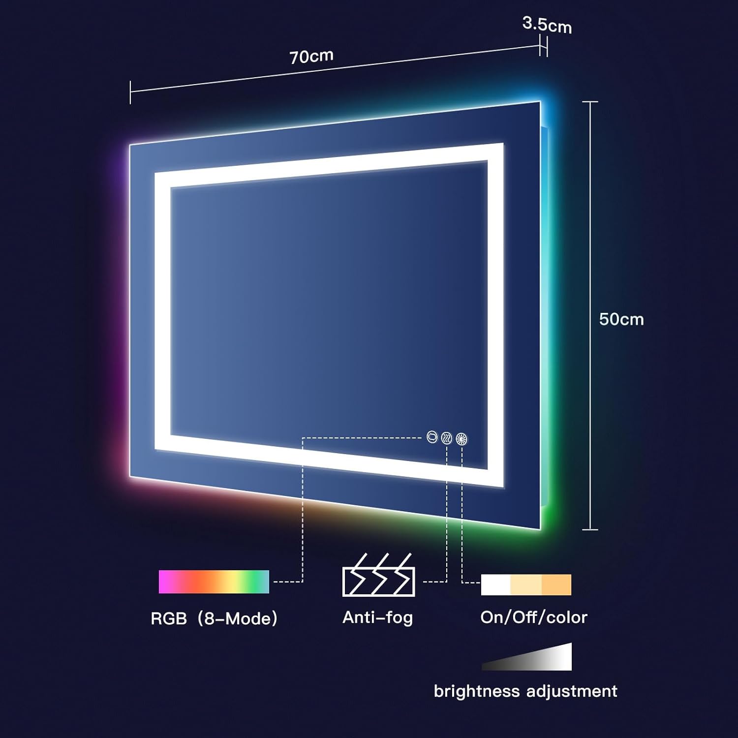 Огледало за баня Dripex с осветление, LED огледало с RGB LED ленти, променящо се цвят, сензорен превключвател, димируемо огледало за баня, против замъгляване, 50 x 70 см