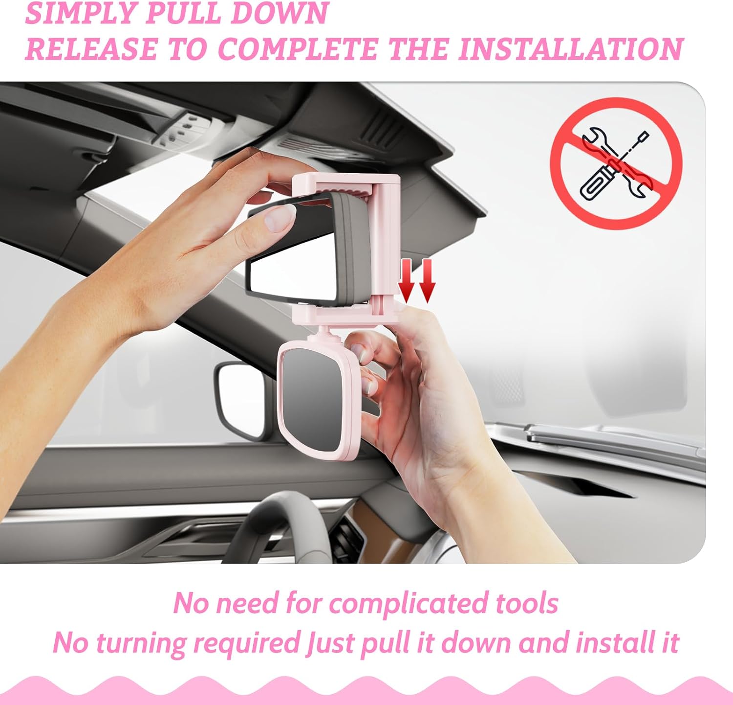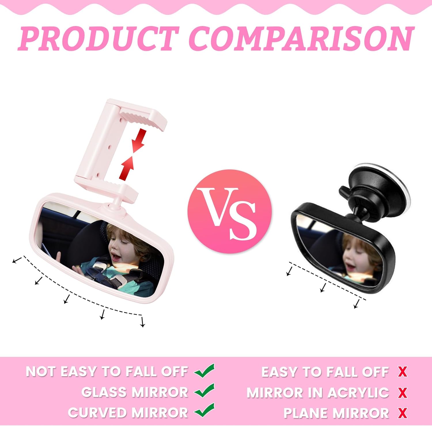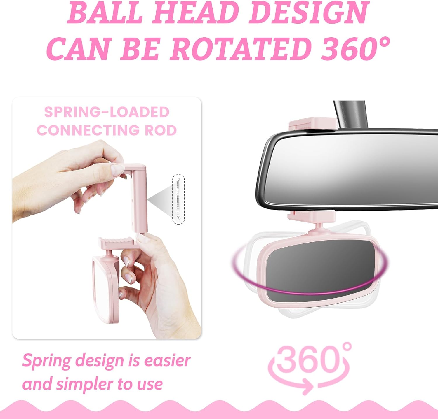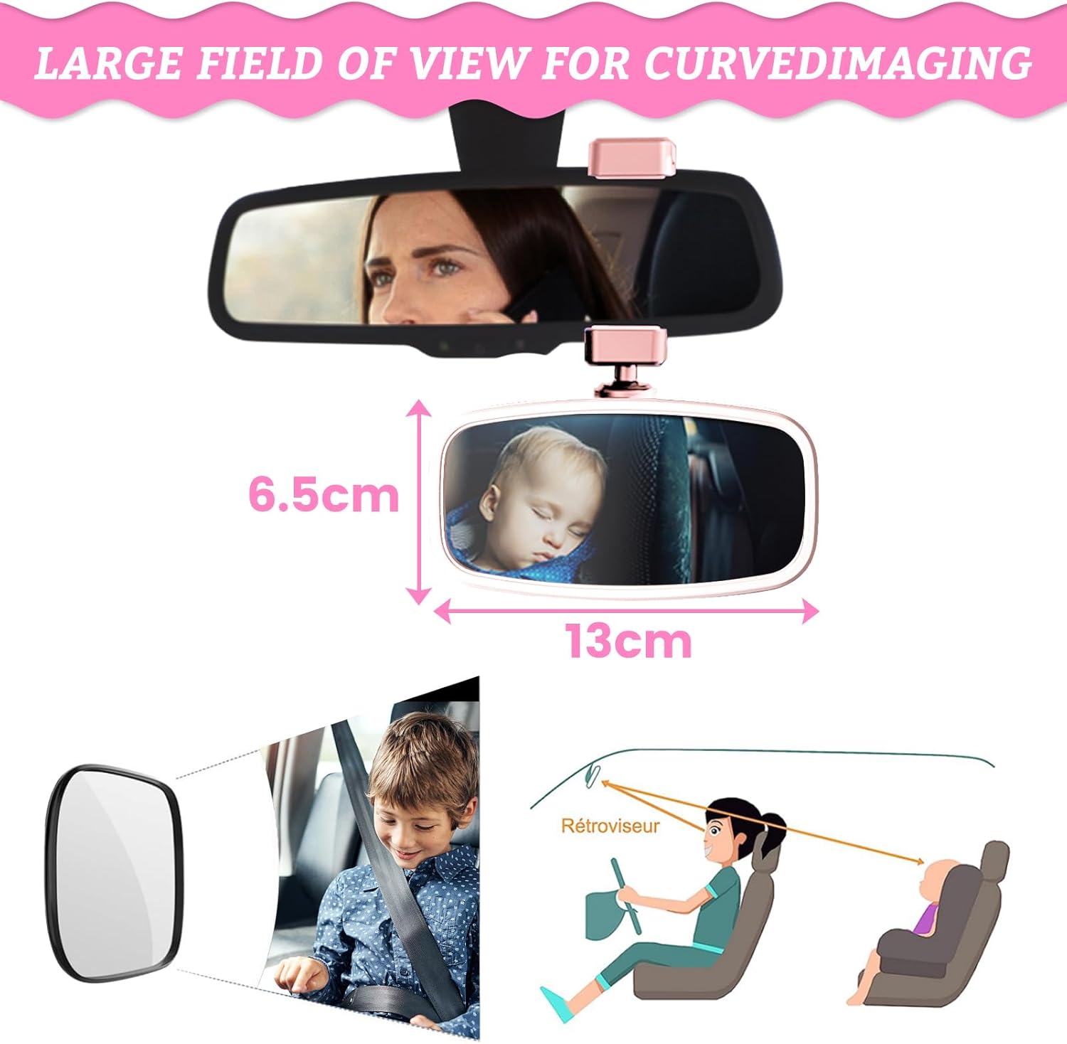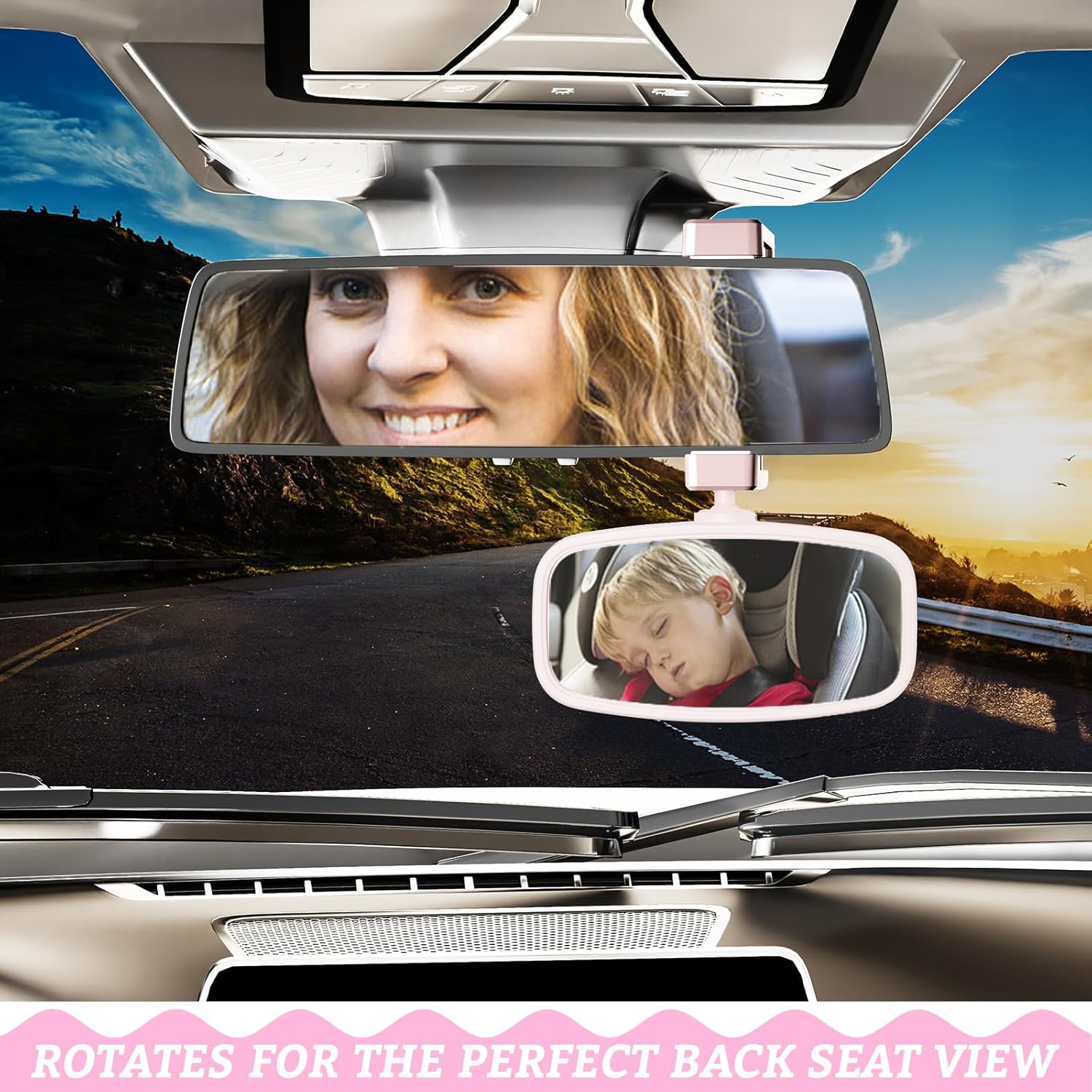 Огледало за бебешка кола, огледало за обратно виждане за бебешка кола с пружинни скоби, стъклено огледало, въртящо се на 360°, огледало за задна седалка за повечето автомобили (129 x 65,8 мм) (розово)