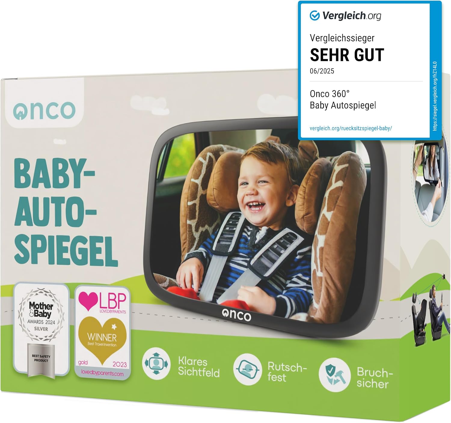 • Двойно награждаван: Наслаждавайте се на безопасни пътувания и наблюдавайте бебето си, докато шофирате, с бебешкото огледало за кола Onco 360°. Огледалото за задната седалка беше отличено със сребро през 2024 г. от „Mother&Baby“ в категорията „Най-добър продукт за безопасност“ и със злато през 2023 г. от „LovedByParents“ в категорията „Най-добро изобретение за пътуване“.