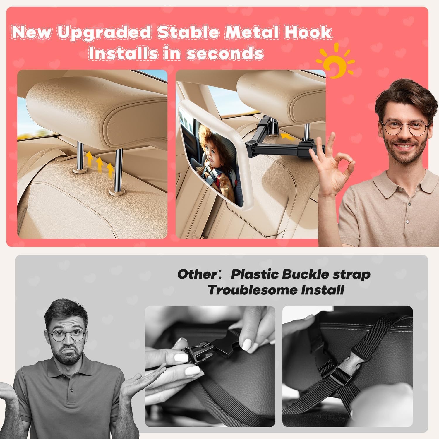 • Подобрена здрава скоба тип кука: скобата тип кука на огледалото за обратно виждане Mirrorsafe за бебета може да се захване здраво за задната седалка и остава стабилна дори на неравни пътища, без да се клатушка. Не са необходими инструменти. Подходяща за повечето автомобили, камиони, микробуси, SUV-ове и зоната на задните седалки. Осигурява ви перфектна видимост.