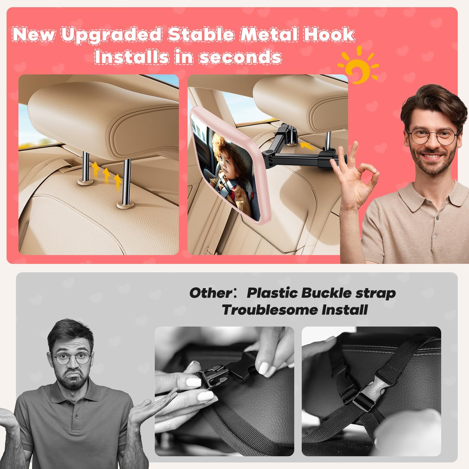 Огледало за кола за бебешка задна седалка: Огледало за бебешка задна седалка с кука, 100% нечупливо и 360° въртящо се огледало за задна седалка, бебешко огледало First Equipment Car за подглавници в кола, розово