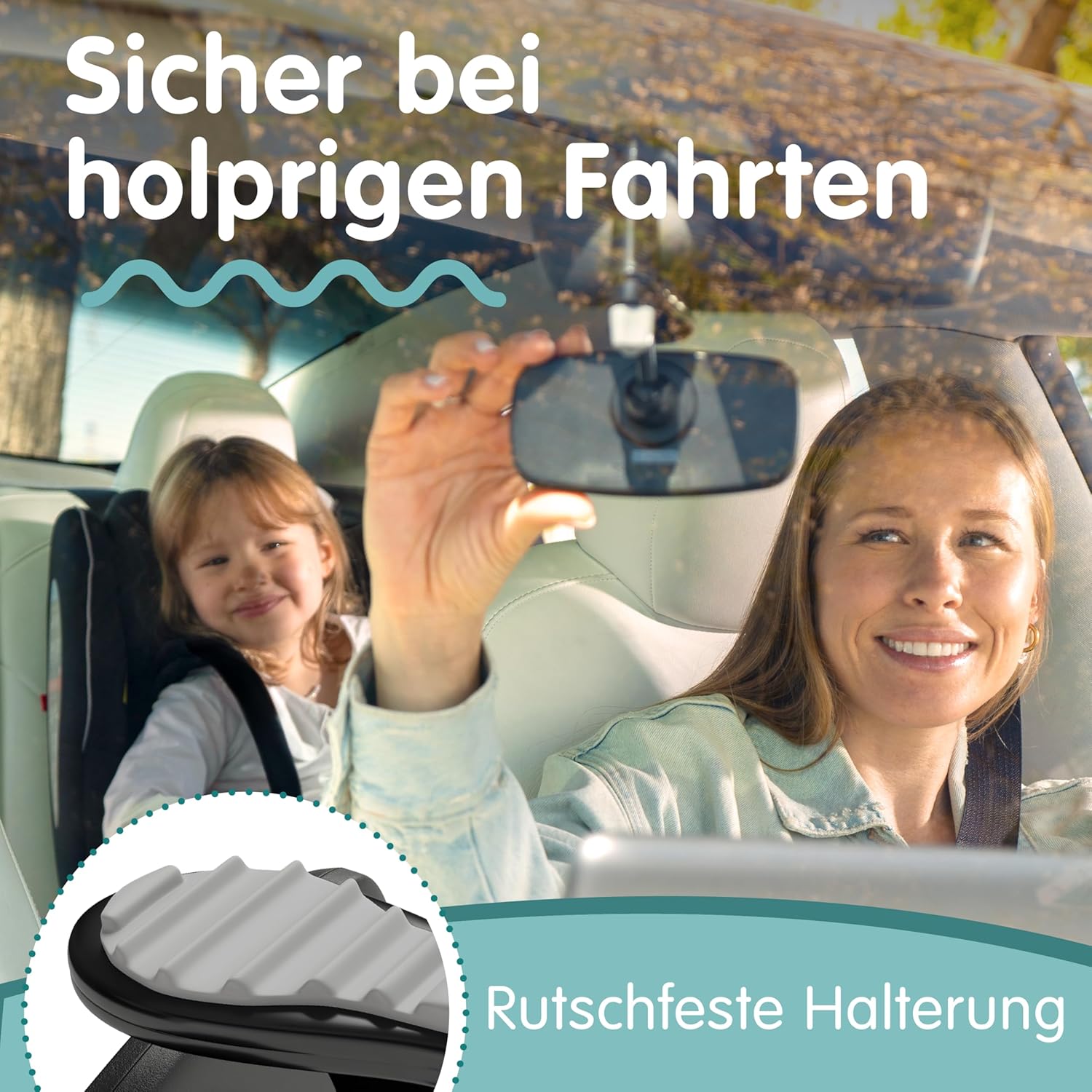 • 100% нечупливо: Огледалото за наблюдение на бебета е изработено от 100% нечуплива пластмаса и остава здраво на мястото си дори при неравни пътувания благодарение на устойчиви на вибрации закрепващи ленти и неплъзгаща се гумена основа.