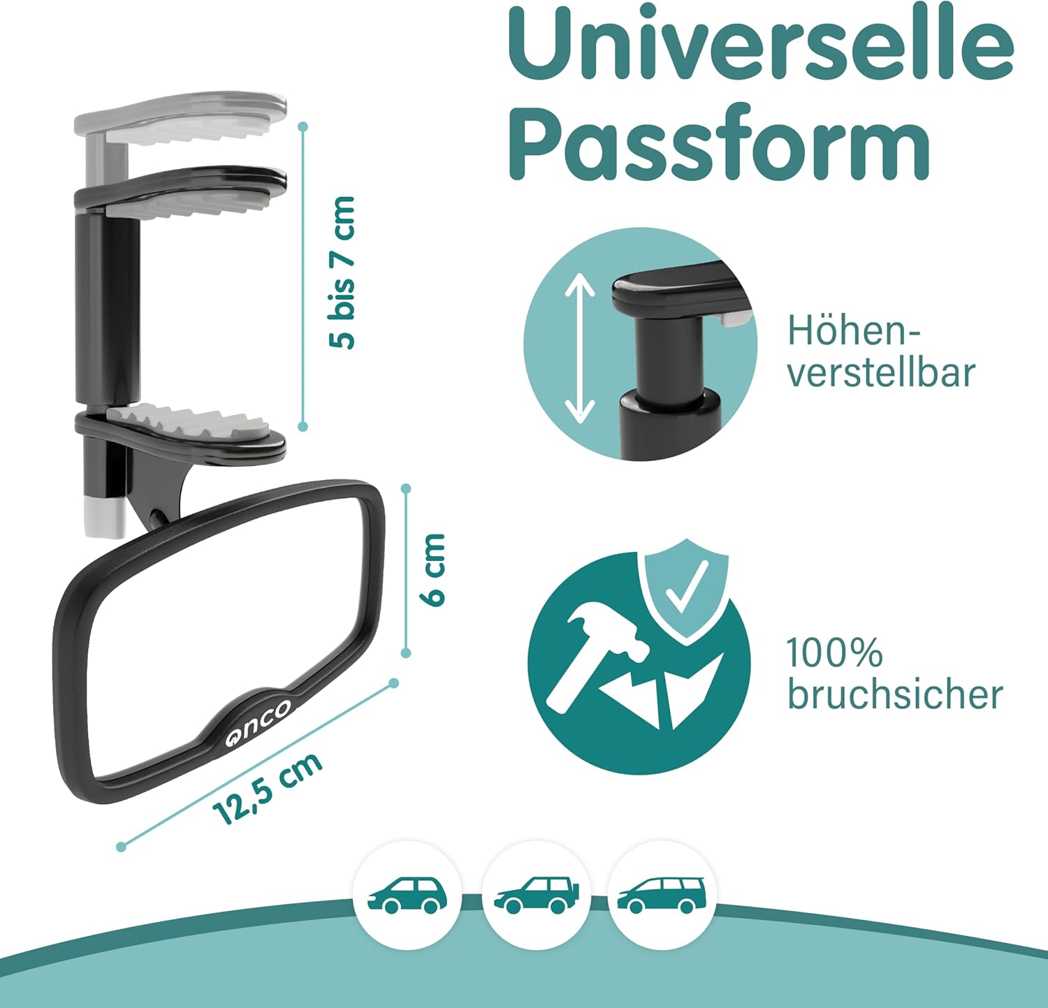 • Бърз и лесен монтаж: Нашето огледало за безопасност предлага три предварително зададени опции за монтаж и е подходящо за всички конвенционални облегалки за глава. Регулируемите закрепващи презрамки са лесни за поставяне, сваляне и индивидуално регулиране.