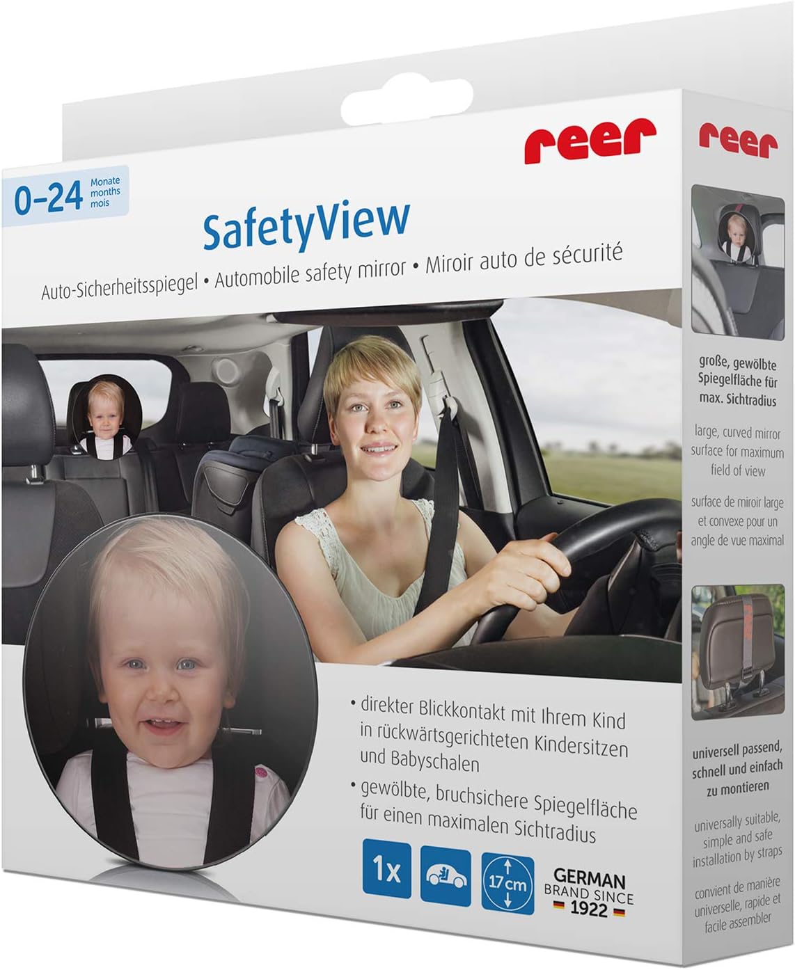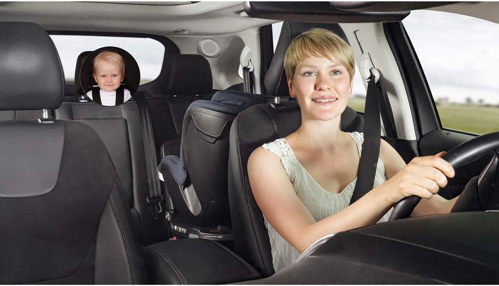 Изключително голяма, извита огледална повърхност за максимален радиус на видимост - намалява риска от инциденти - универсално подходяща за всички превозни средства със задни облегалки за глава - огледално стъкло, изработено от пластмаса за максимална безопасност - тънка, дискретна форма - диаметър 17,5 см. Препоръчителна възраст: 0+ месеца.