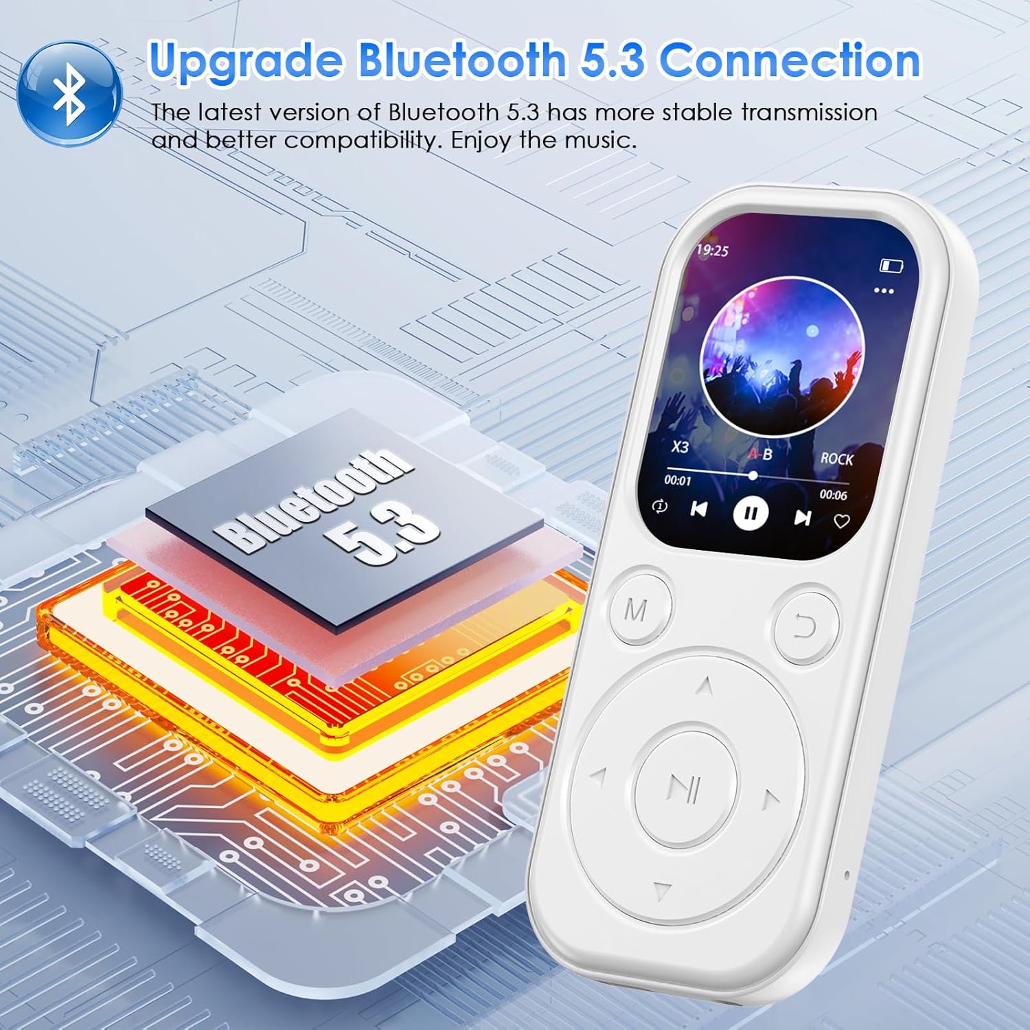 • Bluetooth 5.3: Бърз и стабилен с HiFi звук: безжична свобода благодарение на най-новата технология Bluetooth 5.3! Свържете MP3 плейъра с Bluetooth безпроблемно към слушалки или високоговорители. Идеален за джогинг, пътуване до работа или релакс с кристално чист звук без загуби. Дори потребители, далеч от технологиите, го използват без усилие – музикален плейър за цялото семейство!