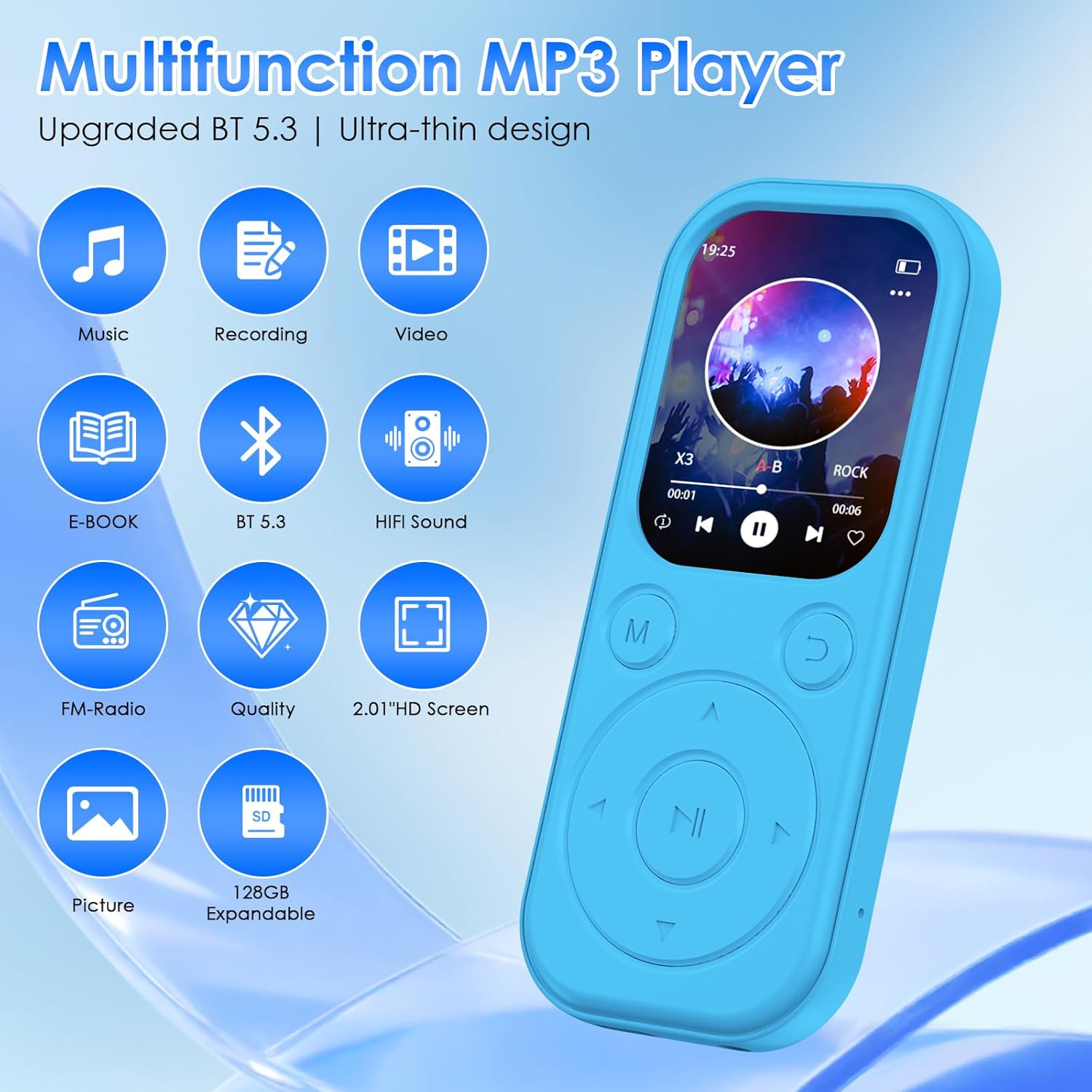 • Многофункционален: повече от просто музикален плейър: FM радио, диктофон, четец на електронни книги и преглед на снимки - този MP3 плейър с Bluetooth е вашият универсален продукт! Насладете се на HiFi звук с дълъг живот на батерията, идеален за училище, офис или почивка. Перфектният подарък за деца, възрастни хора и любители на музиката - просто го включете и тръгвайте!