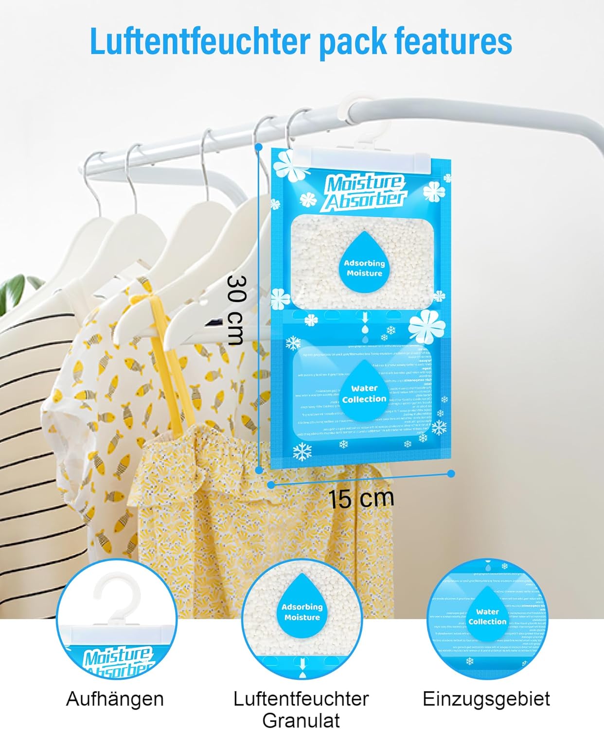 • За окачване: малки гранули за обезвлажнител, дизайн за окачване, могат да се поставят в гардероб/апартамент. Влагоабсорбаторът за гардероб се окачва в помещението, което ще се обезвлажнява, и се окачва на разстояние 5-10 см от дрехите.