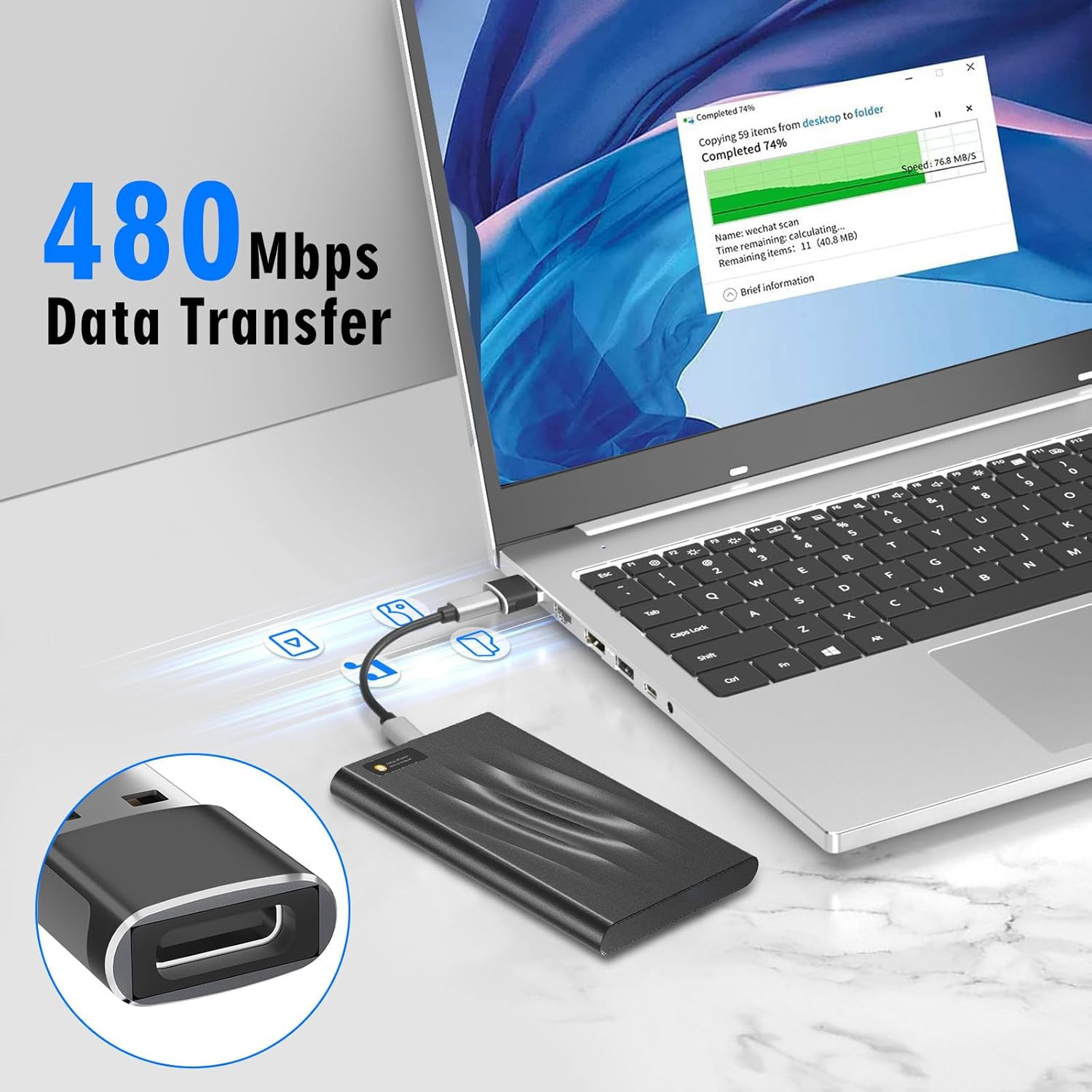 • OTG технология: С OTG (On-The-Go) технологията можете лесно да споделяте снимки, видеоклипове и игри от други устройства в мобилни социални медийни платформи, без да е необходимо да използвате компютъра си. Двата конвертора, USB A и USB C, покриват повечето смарт устройства за ежедневни нужди.