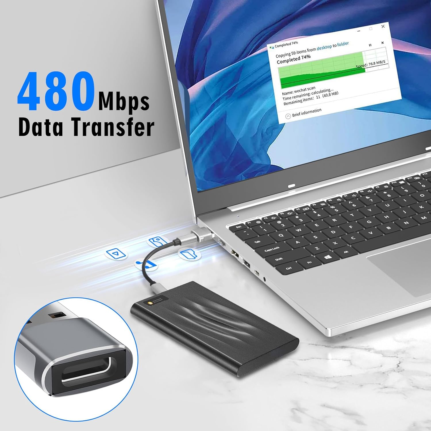 • OTG технология: С OTG (On-The-Go) технологията можете лесно да споделяте снимки, видеоклипове и игри от други устройства в мобилни социални медийни платформи, без да е необходимо да използвате компютъра си. Двата конвертора, USB A и USB C, покриват повечето смарт устройства за ежедневни нужди.