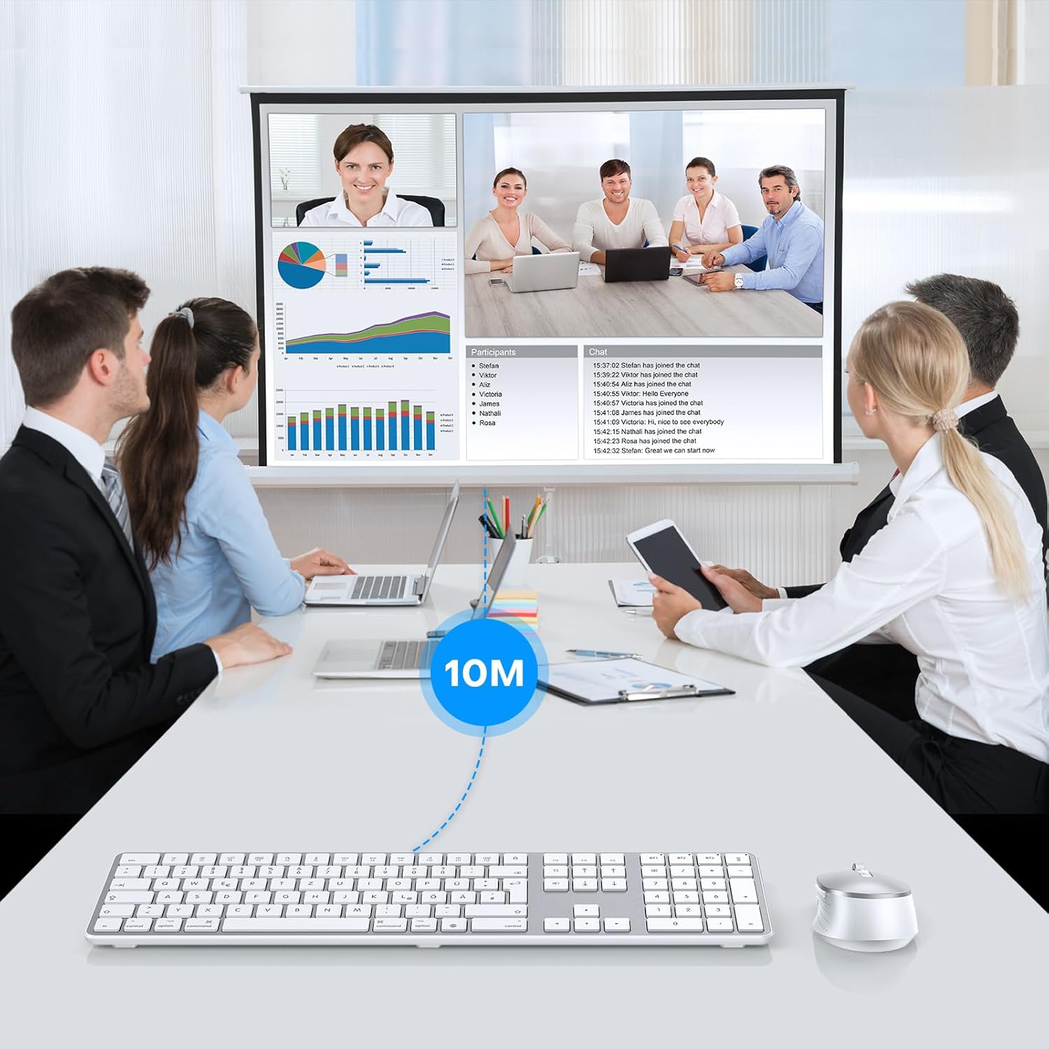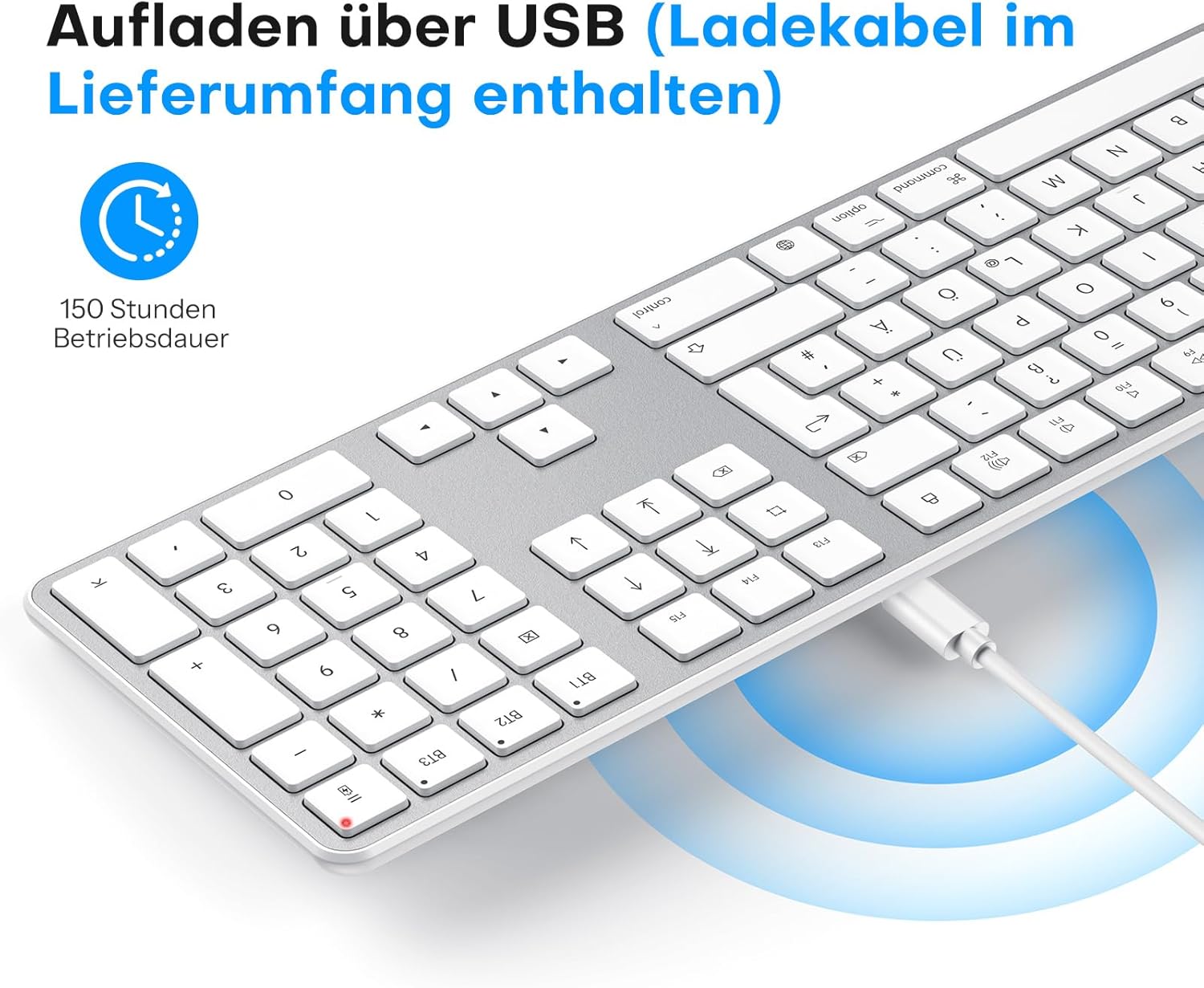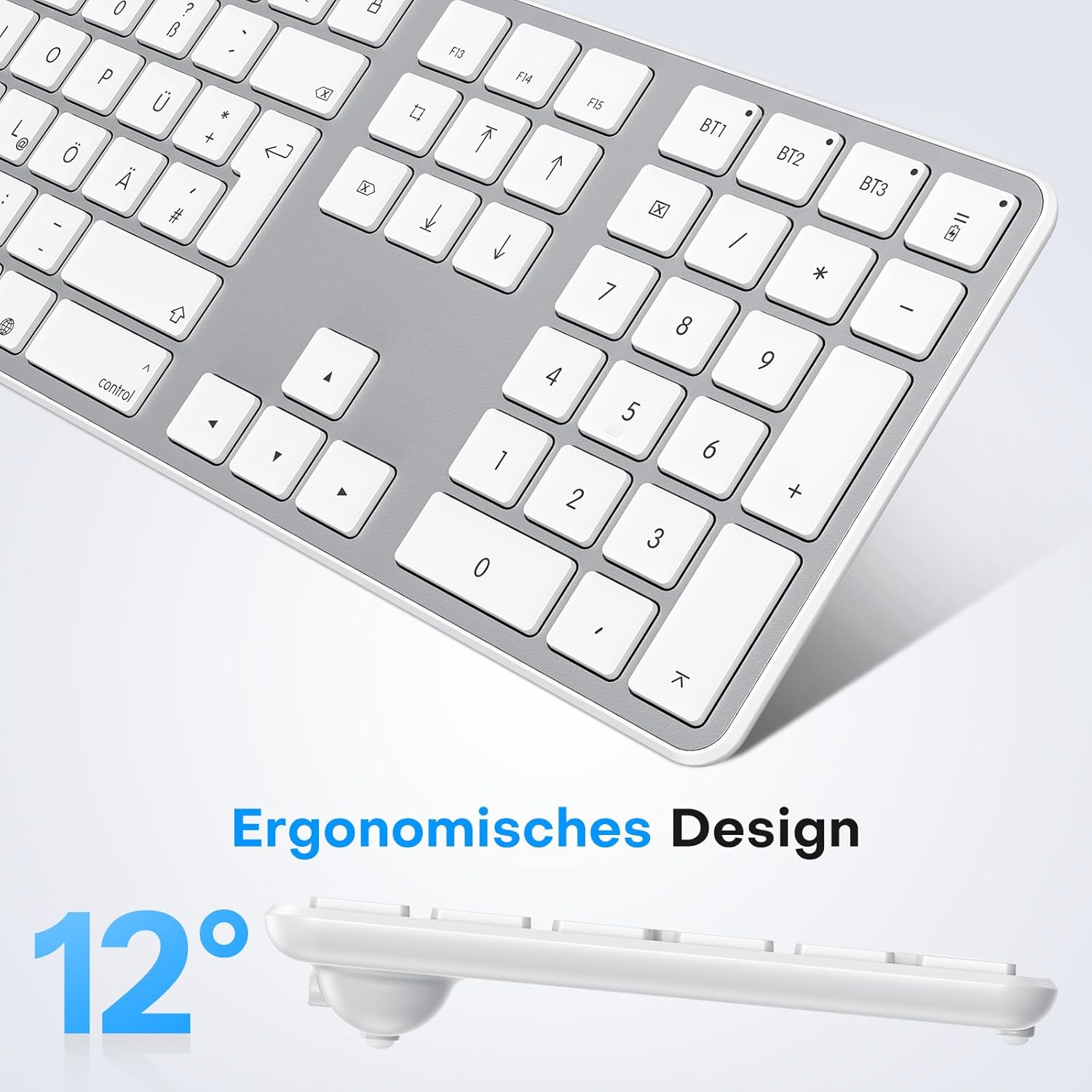 • Немска Bluetooth клавиатура с мишка: Този комплект Bluetooth клавиатура и мишка предлага стабилна връзка на разстояние до 10 метра. Клавиатурата е с ножичнообразна структура на клавишите и ергономичен ъгъл на наклон, осигуряващ удобно и бързо писане.