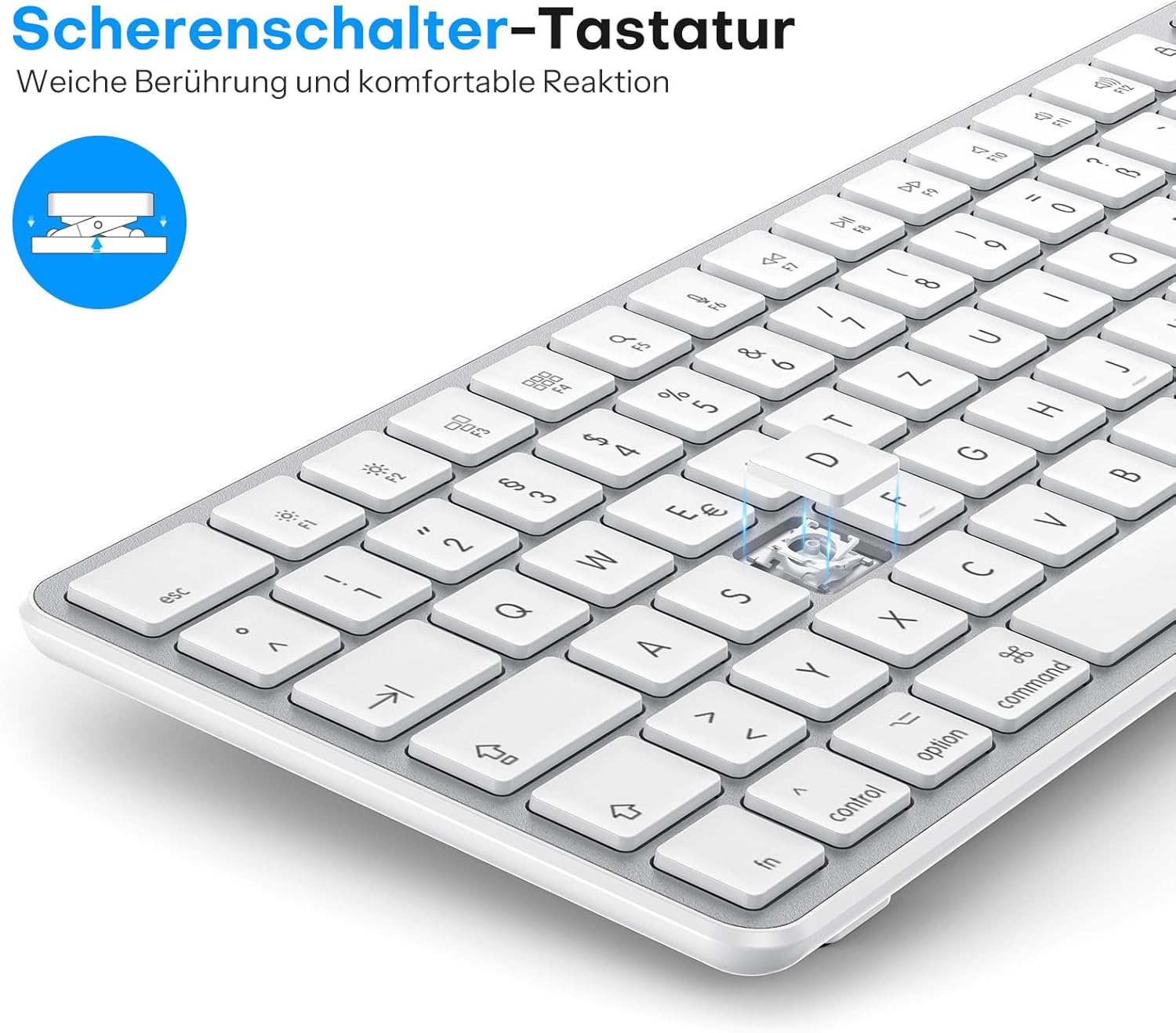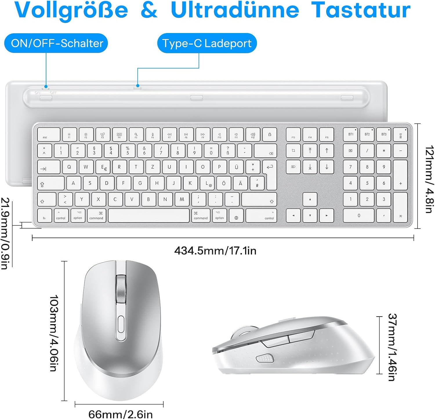 OMOTON Комплект клавиатура и мишка за MacBook Air/Pro/iMac/iMac Pro/Mac mini, безжична Bluetooth клавиатура QWERTZ с мишка, презареждаща се, за множество устройства, ергономична, тихо писане, DE оформление