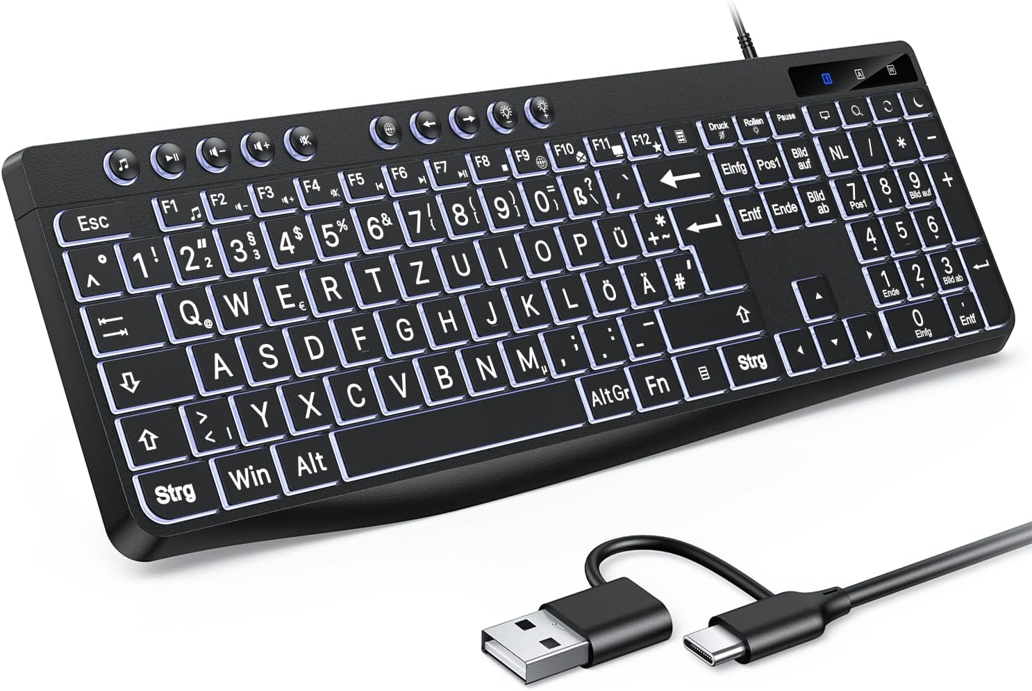 OMOTON Осветен кабел за клавиатура за компютър, QWERTZ бяла осветена клавиатура с голямо налягане, 2-в-1 USB A/C за възрастни хора, деца, хора с увредено зрение за Windows с мултимедийни клавиши (черен)