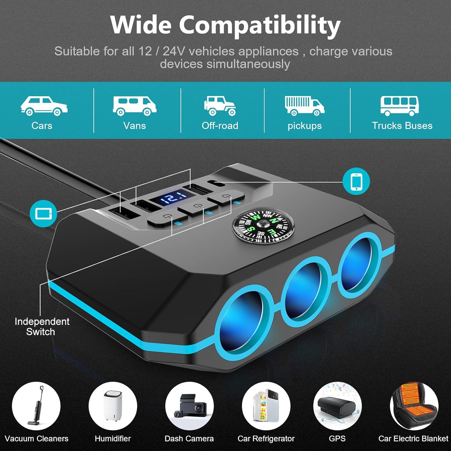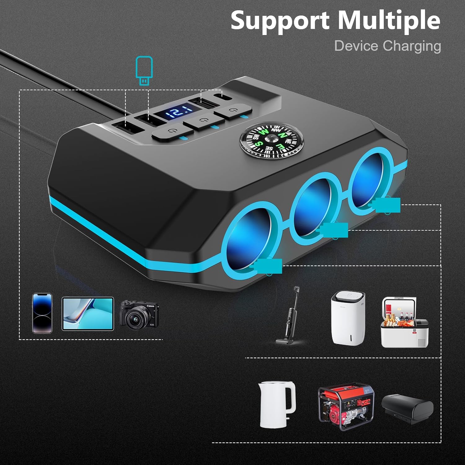 Der 7 in 1 zigarettenanzünder verteiler kann mehrere Geräte mit Strom versorgen, wie tragbare Navigationssysteme, Laufwerksrekorder, Überwachungskameras im Fahrzeug, Smartphones und Tablets, Autostaubsauger und Kühlschränke im Fahrzeug.