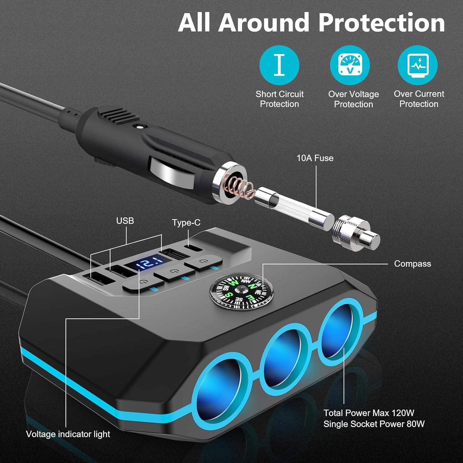 Dieses 7 in 1 USB kfz ladegerät verfügt über eine integrierte austauschbare 10 Ampere sichere Sicherung und komplette Schutzschaltung, die verhindern können, dass der Autostromteiler und Ihre Geräte überhitzen, überladen oder kurzgeschlossen sind.