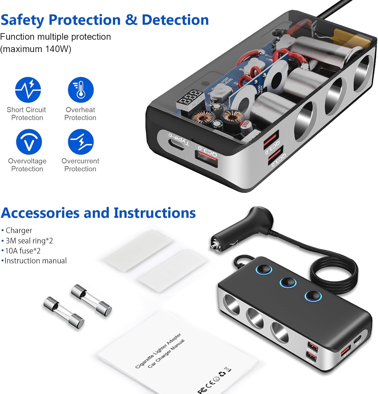 Dieses USB zigarettenanzünder verteiler aus schlagfestem ABS- und PCBA-Materialien ist staubdicht, fallsicher, hitzebeständig und kältebeständig. Die Zahl der Steckdosen nimmt von 1 auf 3 zu, keine Sorge über Lademangel mehr!