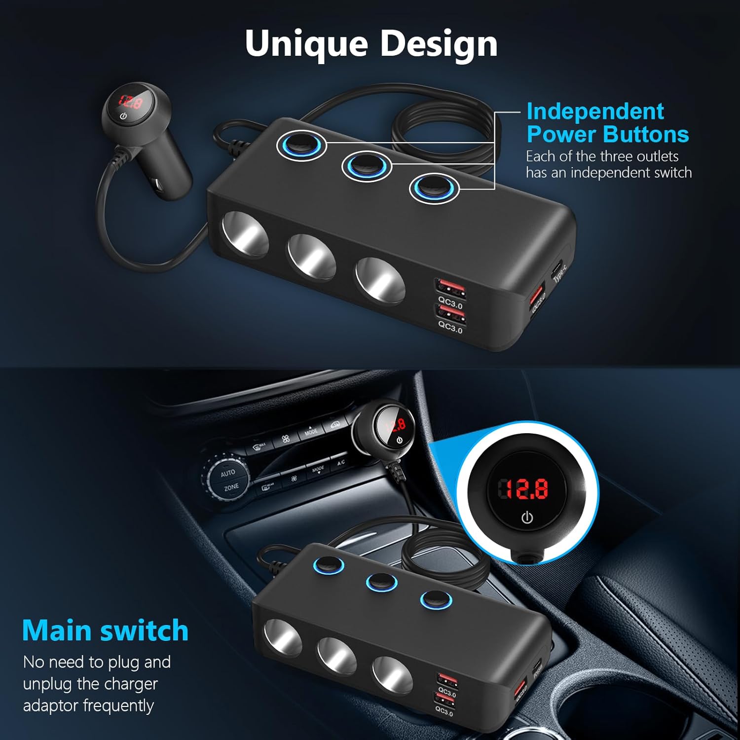 Der unabhängige Schalter für jede Zigarettenanzünderbuchse kann das Ein- oder Ausziehen von Geräten reduzieren und die Lebensdauer des Geräts verlängern, ohne andere Ladegeräte zu beeinträchtigen. Der Hauptnetzschalter steuert alle Steckdosen und USB-Anschlüsse. Keine Notwendigkeit, sich über Überlastung und Überstromprobleme zu sorgen!