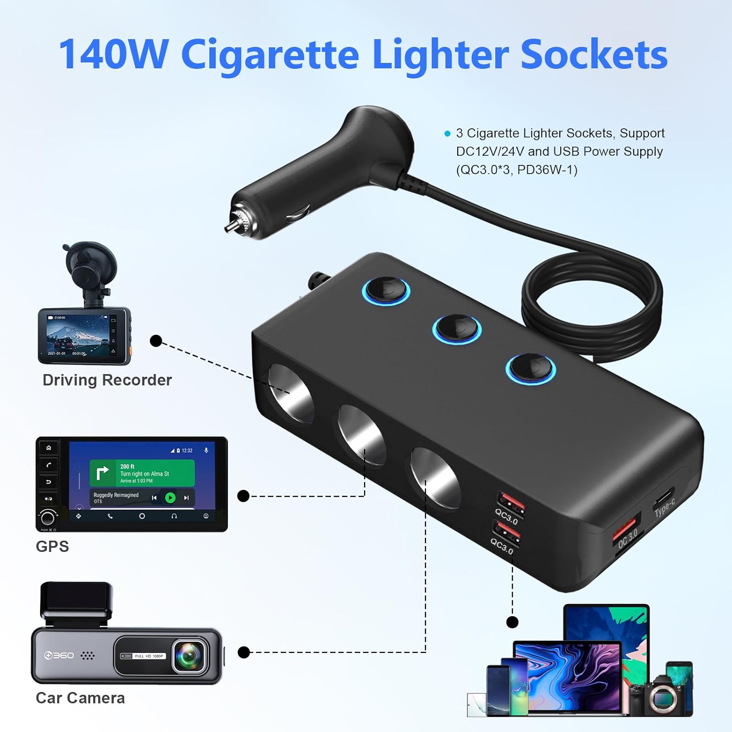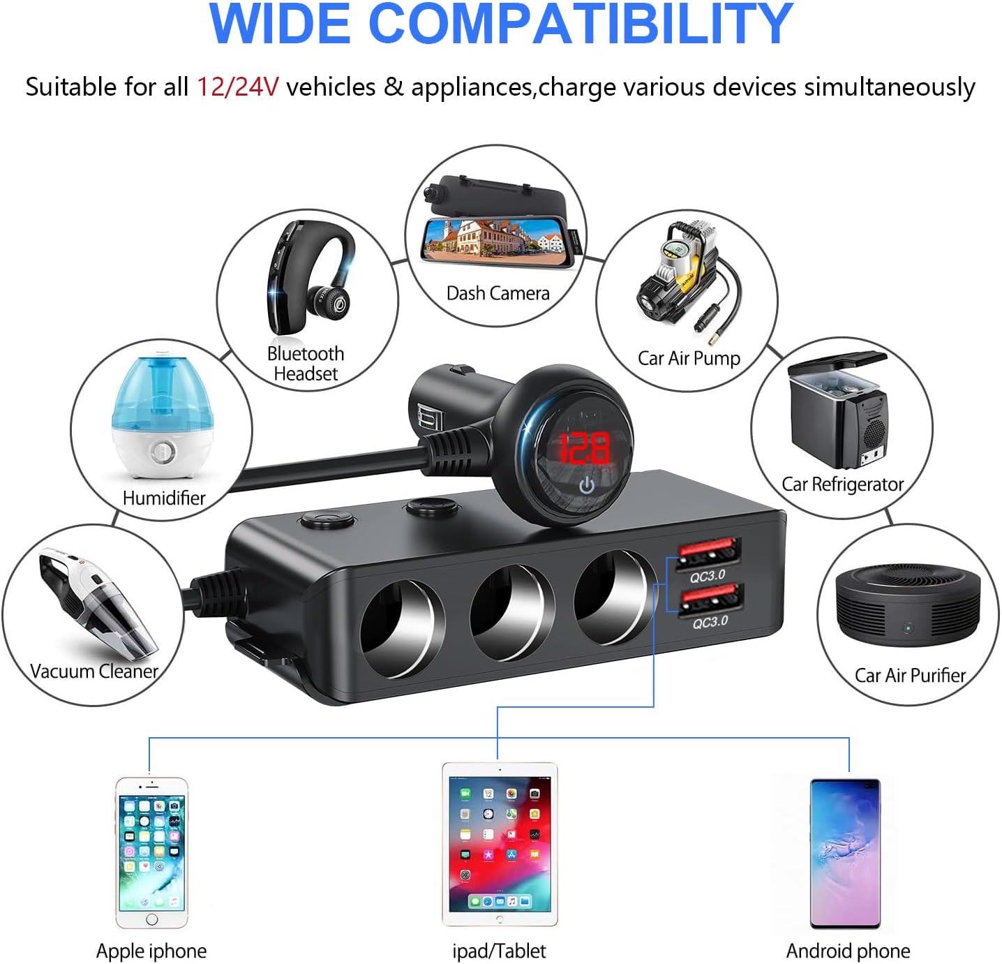 Der 7 in 1 zigarettenanzünder verteiler kann mehrere Geräte mit Strom versorgen, wie tragbare Navigationssysteme, Laufwerksrekorder, Überwachungskameras im Fahrzeug, Smartphones und Tablets, Autostaubsauger und Kühlschränke im Fahrzeug.