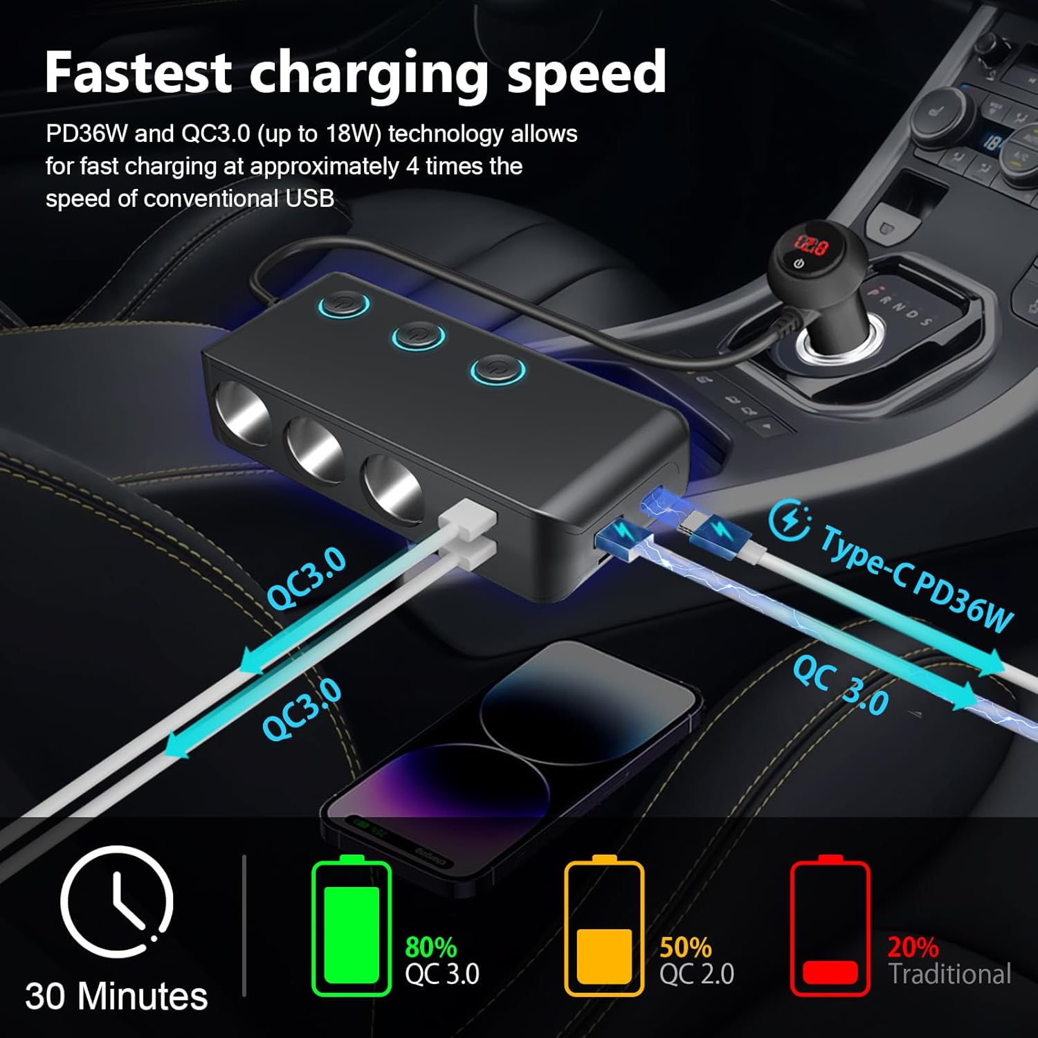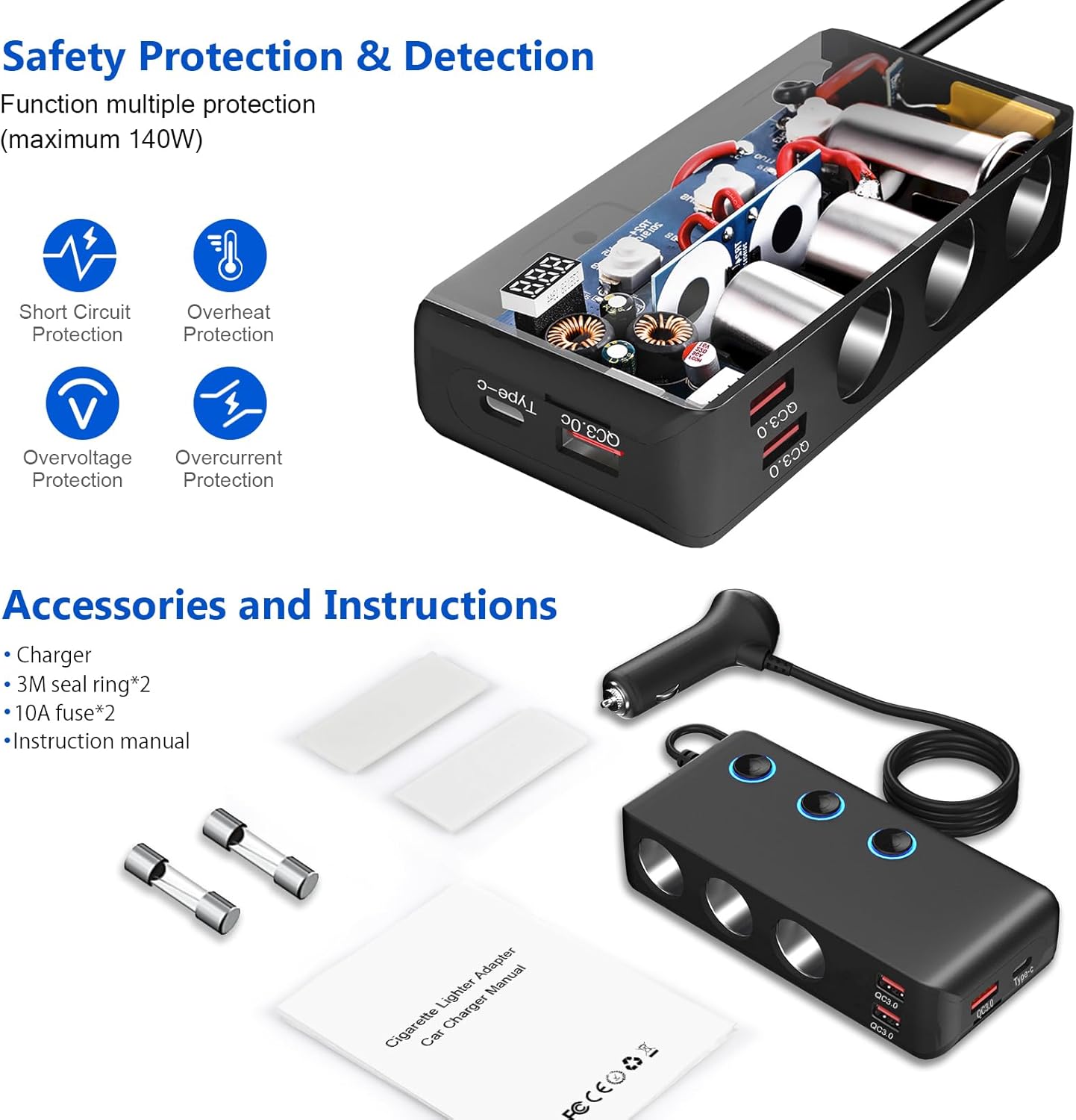 Dieses USB zigarettenanzünder verteiler aus schlagfestem ABS- und PCBA-Materialien ist staubdicht, fallsicher, hitzebeständig und kältebeständig. Die Zahl der Steckdosen nimmt von 1 auf 3 zu, keine Sorge über Lademangel mehr!