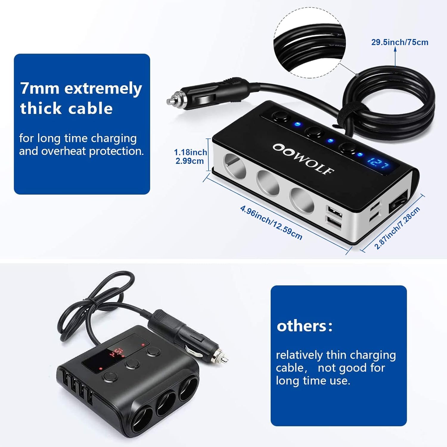 1. Разширен от 2 на 4 порта и 3 гнезда за запалка на много конкурентна цена. USB адаптерът за запалка OOWOLF има един USB 3.0 порт за бързо зареждане и три 3.6A USB 2.0 порта. 3-те гнезда за запалка осигуряват достатъчно захранване за вашите преносими устройства, когато използвате гнездото за запалка в колата си.
