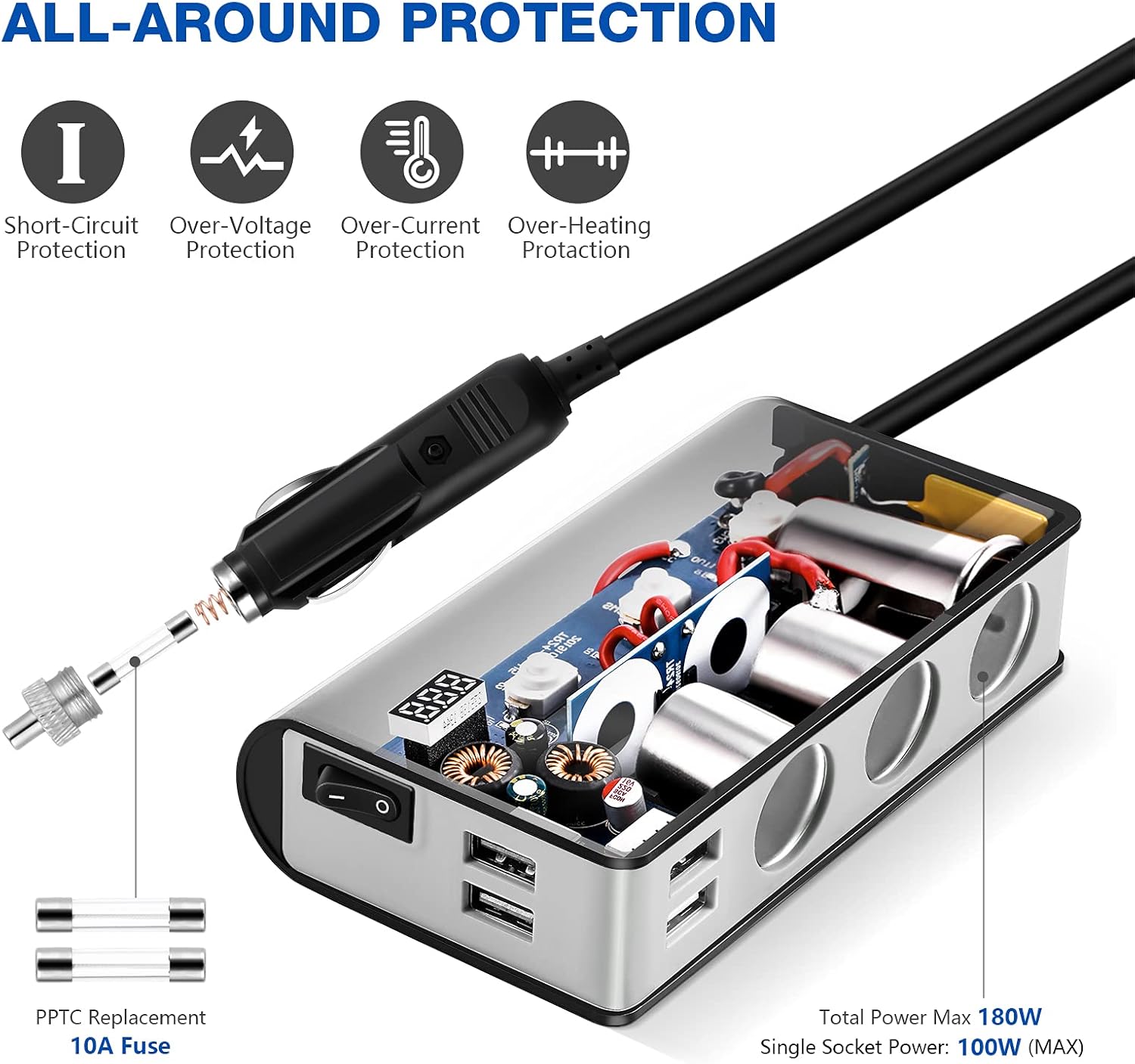Der unabhängige Schalter für jede Zigarettenanzünderbuchse kann das Ein- oder Ausziehen von Geräten reduzieren und die Lebensdauer des Geräts verlängern, ohne andere Ladegeräte zu beeinträchtigen. Der Hauptnetzschalter steuert alle Steckdosen und USB-Anschlüsse. Keine Notwendigkeit, sich über Überlastung und Überstromprobleme zu sorgen!