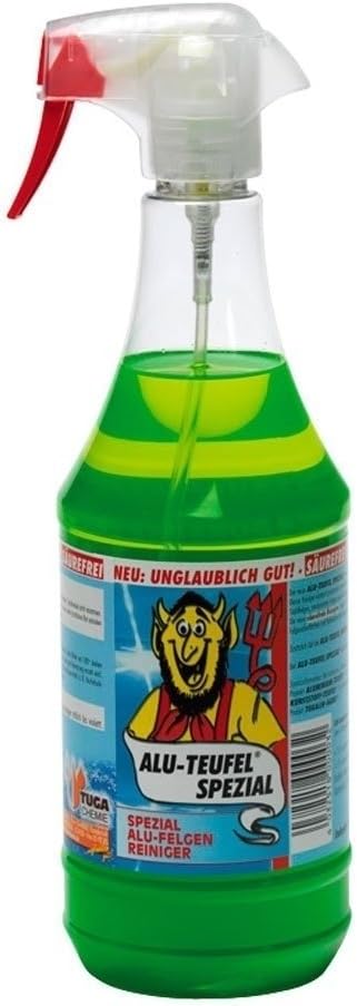 Почиствателят Alu-Teufel е изключително мощен гел за почистване на джанти и капачки. Лесно премахва спирачен прах, остатъци от масло и гума, както и филми от ръжда. Гелът прилепва много здраво към джантата, осигурявайки обширен и високоефективен слой влага. По време на активно почистване препаратът придобива червеникав цвят. Почистването е автоматично: напръскайте, оставете да действа и изплакнете със силна струя вода. Мощен срещу спирачен прах, нежен към джантата. „Alu-Teufel Special“ не съдържа киселини и следователно е идеален за редовна поддръжка на джанти. Подходящ за всички видове джанти (включително хромирани, многокомпонентни и висококачествени). Съставки: Вода, натриев тиогликолат, натриев лаурет сулфат, каприл глюкозид, ксантанова гума, кумарин, хексил цинамал. Съставки: 2 x 1 литър