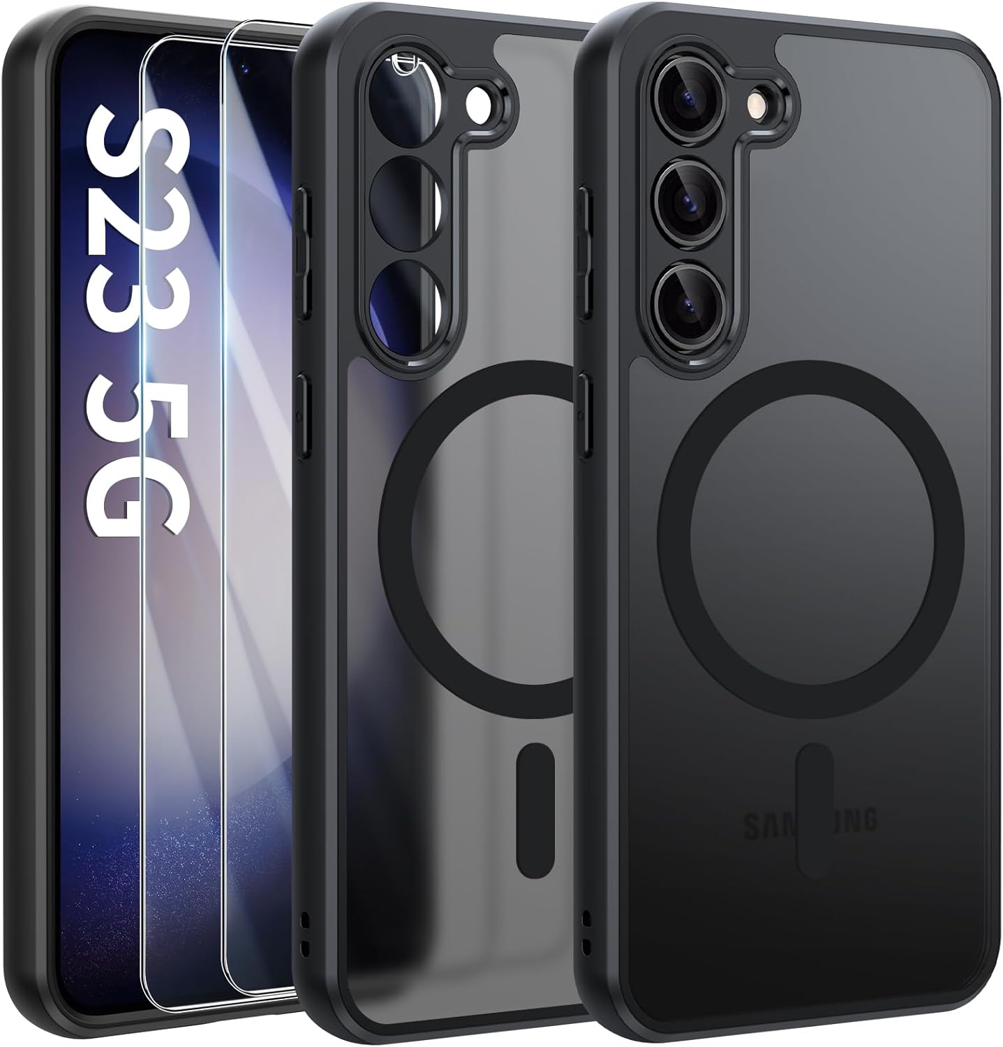 Opkiegrn Магнитен калъф за мобилен телефон, съвместим със Samsung Galaxy S23 5G, съвместим с MagSafe с 2 защитни филма, пълна защита на камерата, удароустойчив, тънък, прозрачен матов защитен калъф