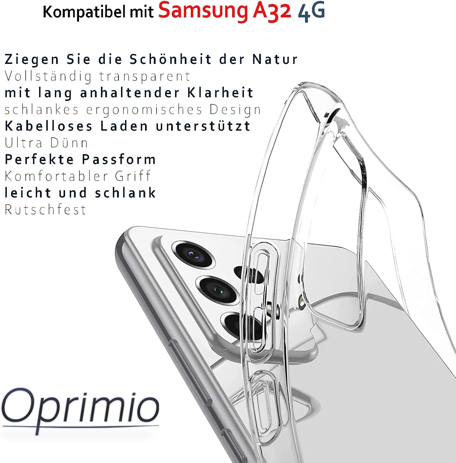 Oprimio Crystal Clear Case за Samsung A32 4G [Силиконов калъф] [100% прозрачен] [Немски материал] [Ултра тънък] Прозрачен калъф за мобилен телефон за Samsung Galaxy A32 4G (не 5G)