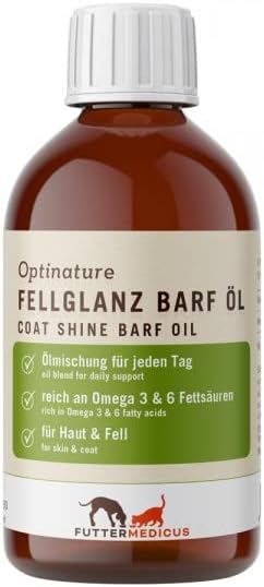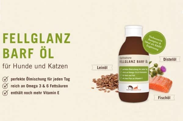 Optinature Coat Shine BARF Oil е перфектна смес от шафраново масло, ленено масло и рибено масло, която може да помогне за оптималното снабдяване на вашия домашен любимец с всички есенциални мастни киселини. Шафрановото масло осигурява високо количество линолова киселина, лененото масло - ценната алфа-линоленова киселина, а рибеното масло е особено богато на омега-3 мастни киселини EPA (ейкозапентаенова киселина) и DHA (докозахексаенова киселина). Тези мастни киселини са важни за здравата кожа и козина и могат също така да помогнат за поддържане на нормалната функция на бъбреците, черния дроб и ставите. Витамин Е в Optinature Coat Shine BARF Oil, със своите антиоксидантни свойства, може също да допринесе за нормалната функция на кожата и козината. Комбинацията от тези ценни масла прави Optinature Coat Shine BARF Oil особено подходящо за ежедневното снабдяване с мастни киселини на кучета и котки. То е идеална добавка към готвени и BARF диети. Храненето с допълнителни масла вече не е необходимо.