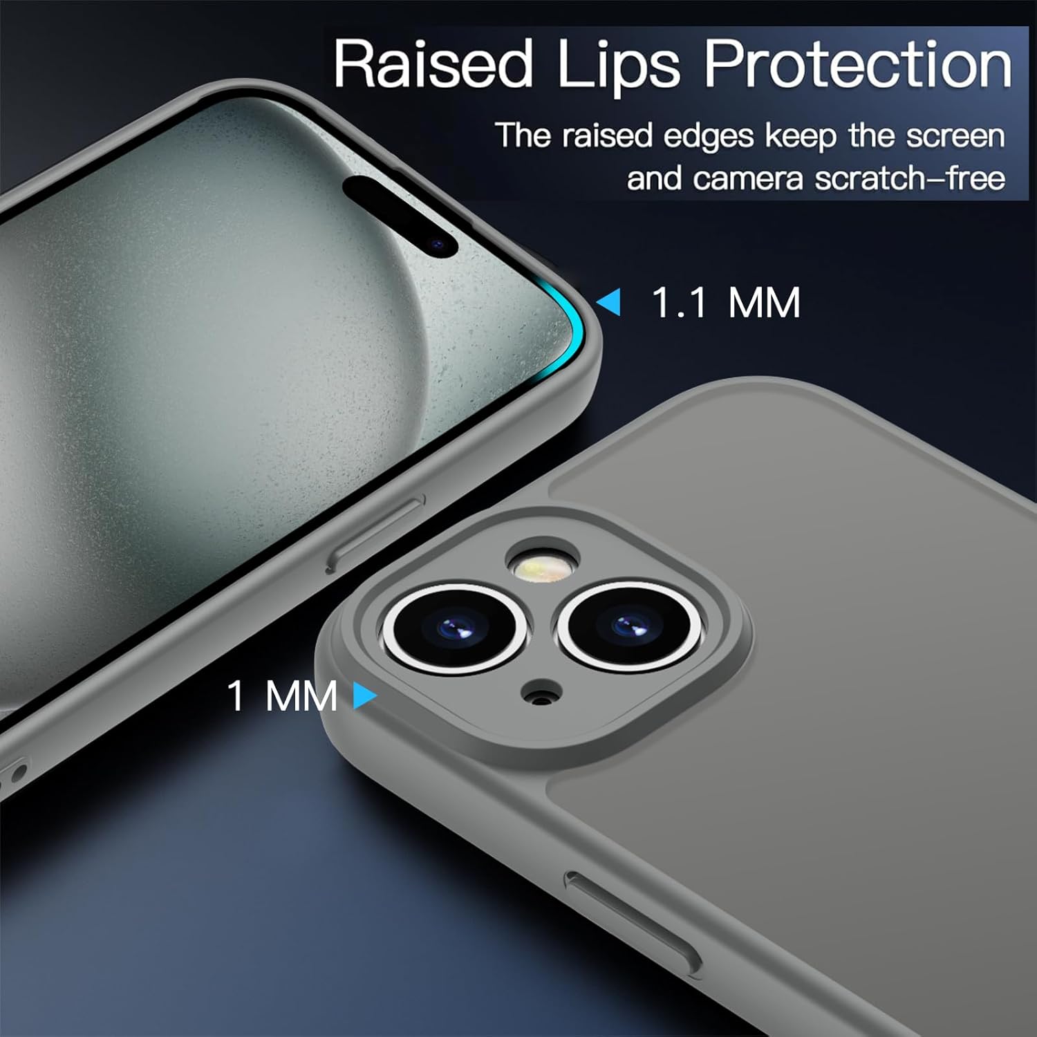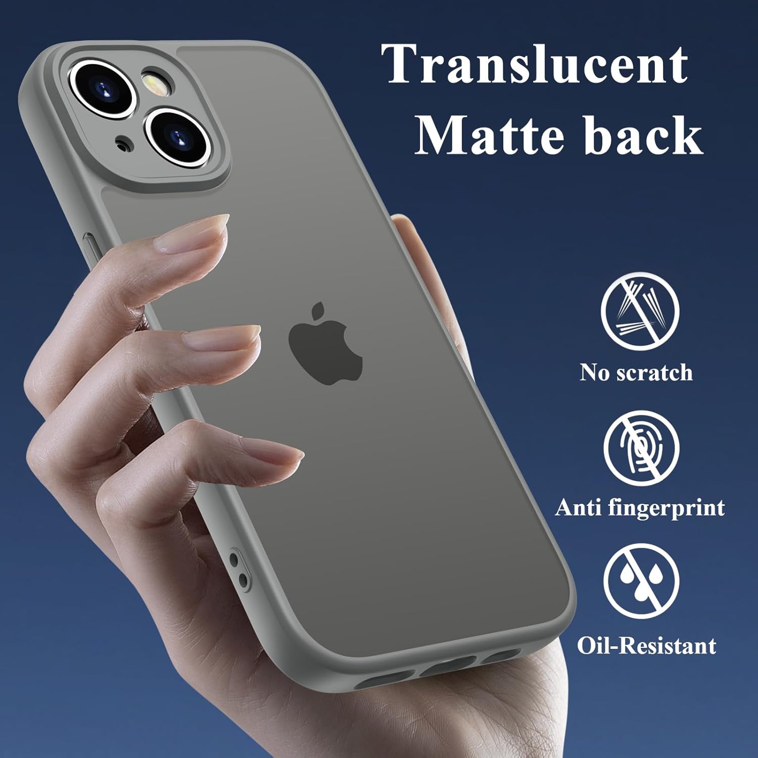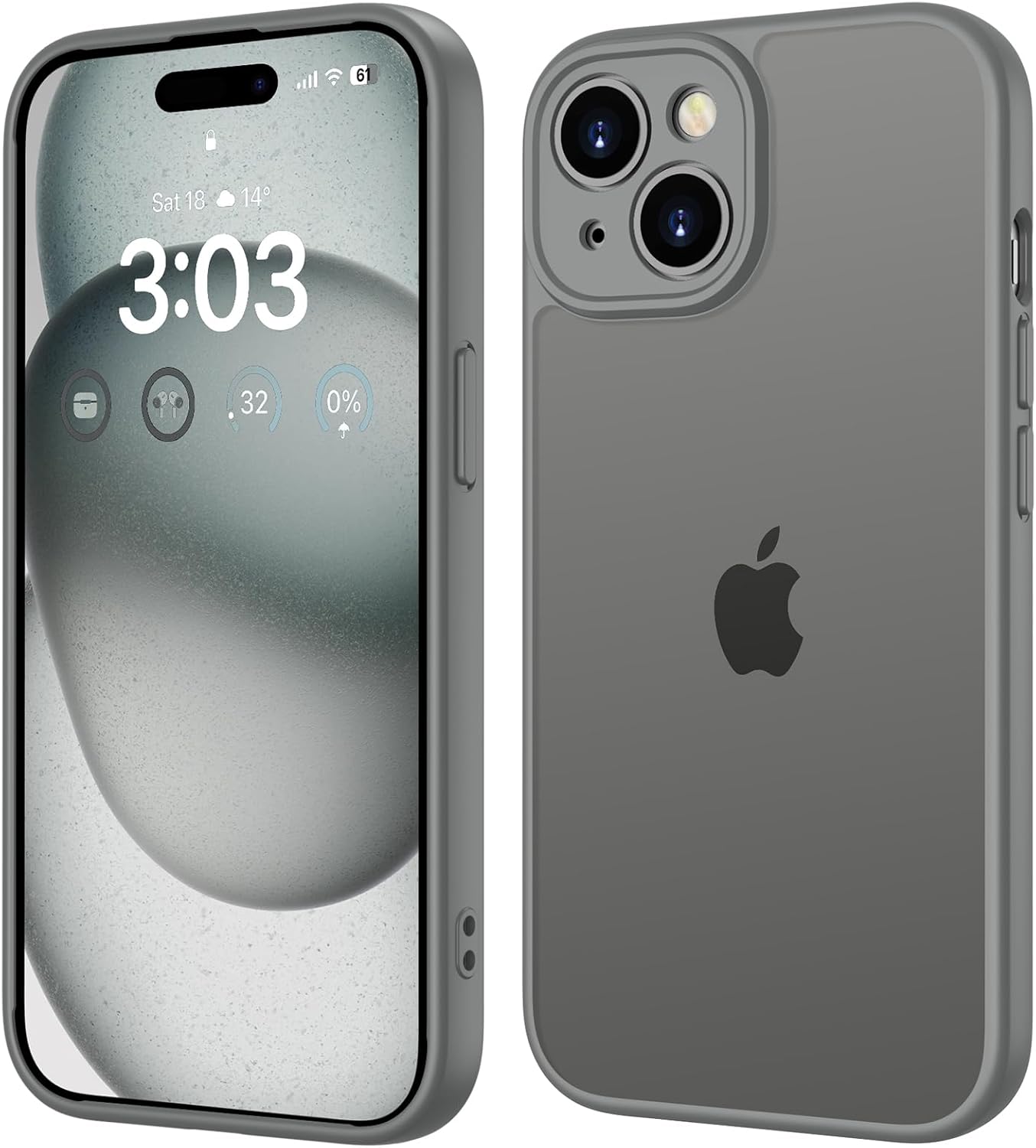 ORDA калъф за iPhone 15 6.1 инча, пълна защита на камерата, удароустойчив, устойчив на надраскване, прозрачен защитен калъф за гръб, матов калъф за мобилен телефон против пръстови отпечатъци за iPhone 15 (сив)