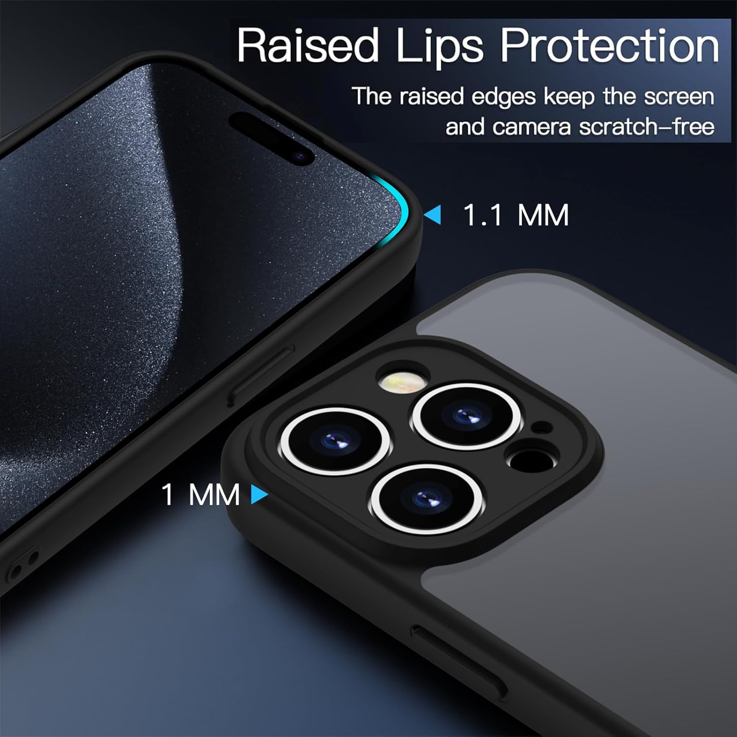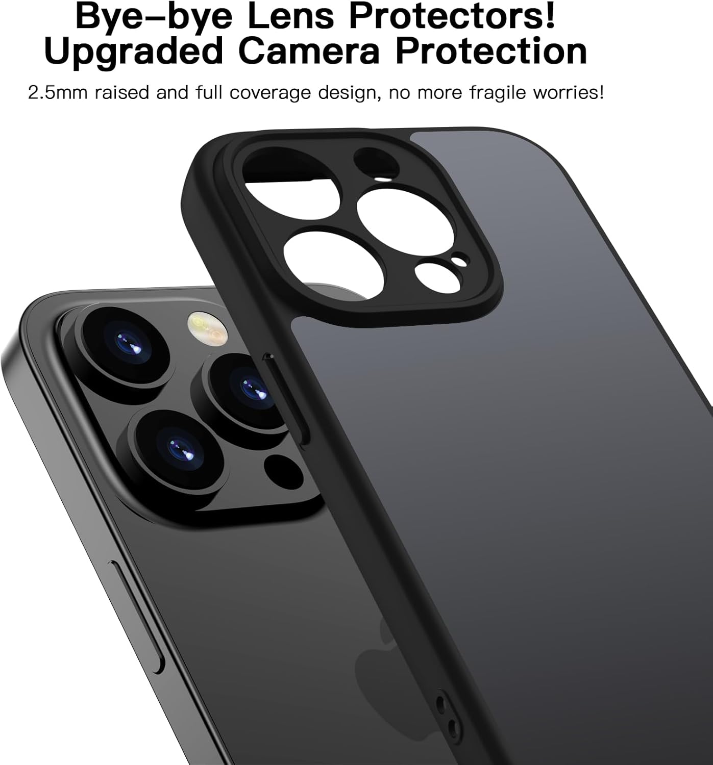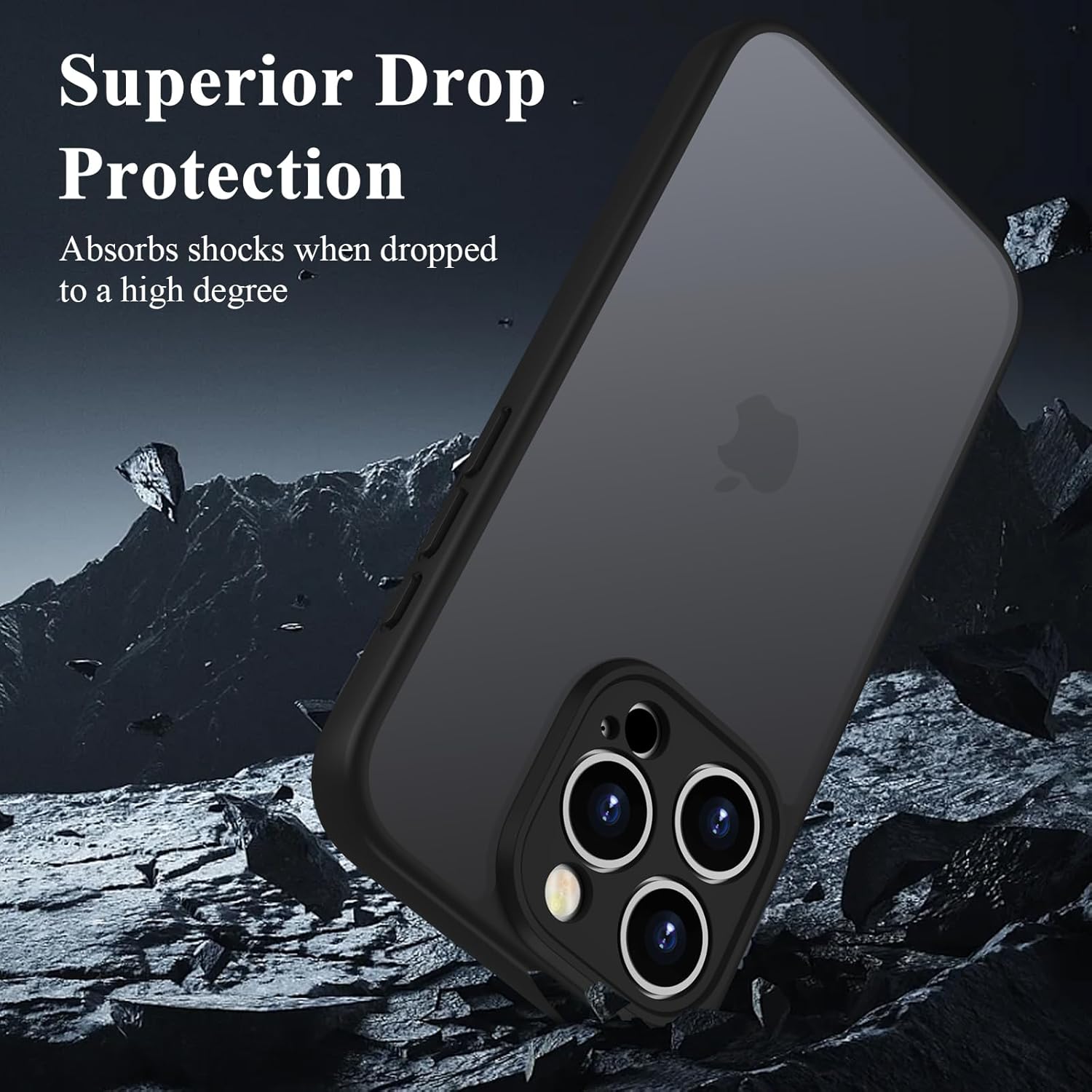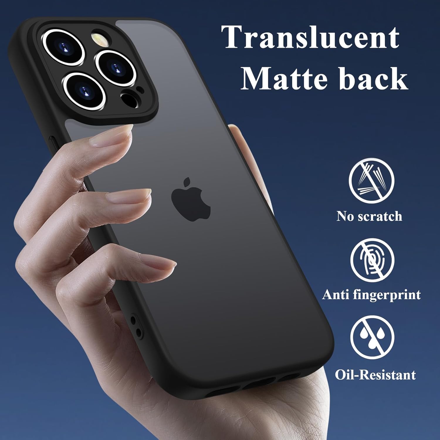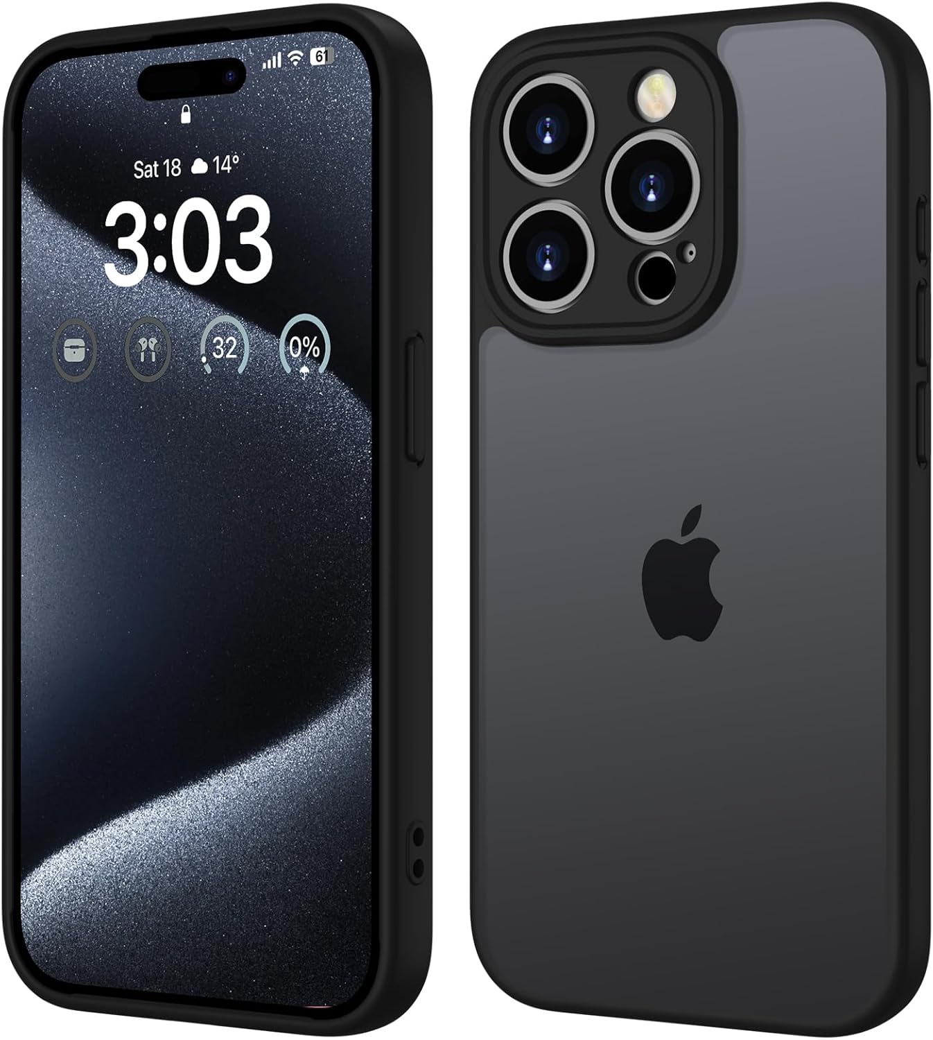 ORDA калъф за iPhone 15 Pro, 6.1 инча, пълна защита на камерата, удароустойчив, устойчив на надраскване, прозрачен защитен калъф за гръб, матов калъф за мобилен телефон против пръстови отпечатъци за iPhone 15 Pro (черен)