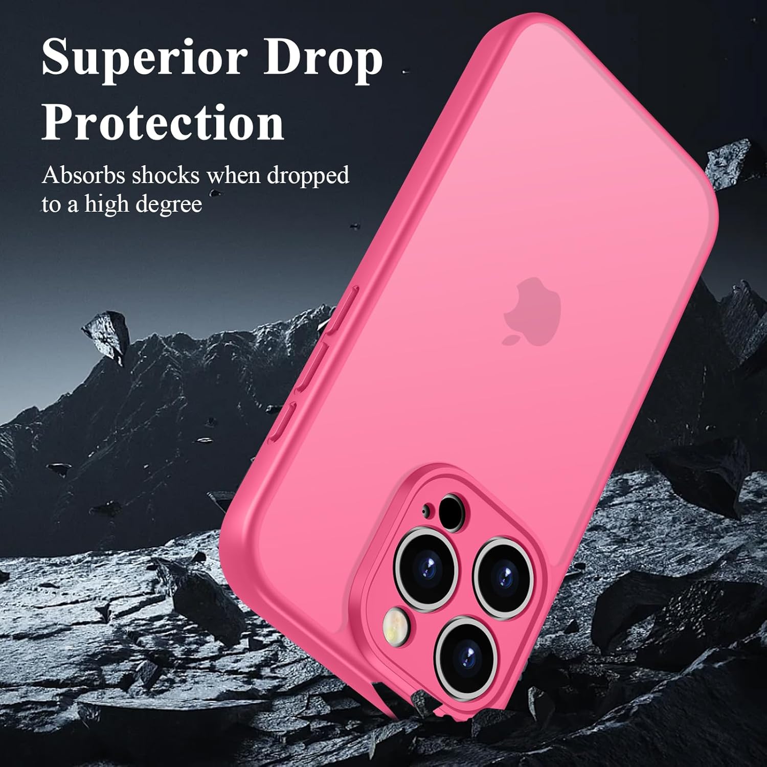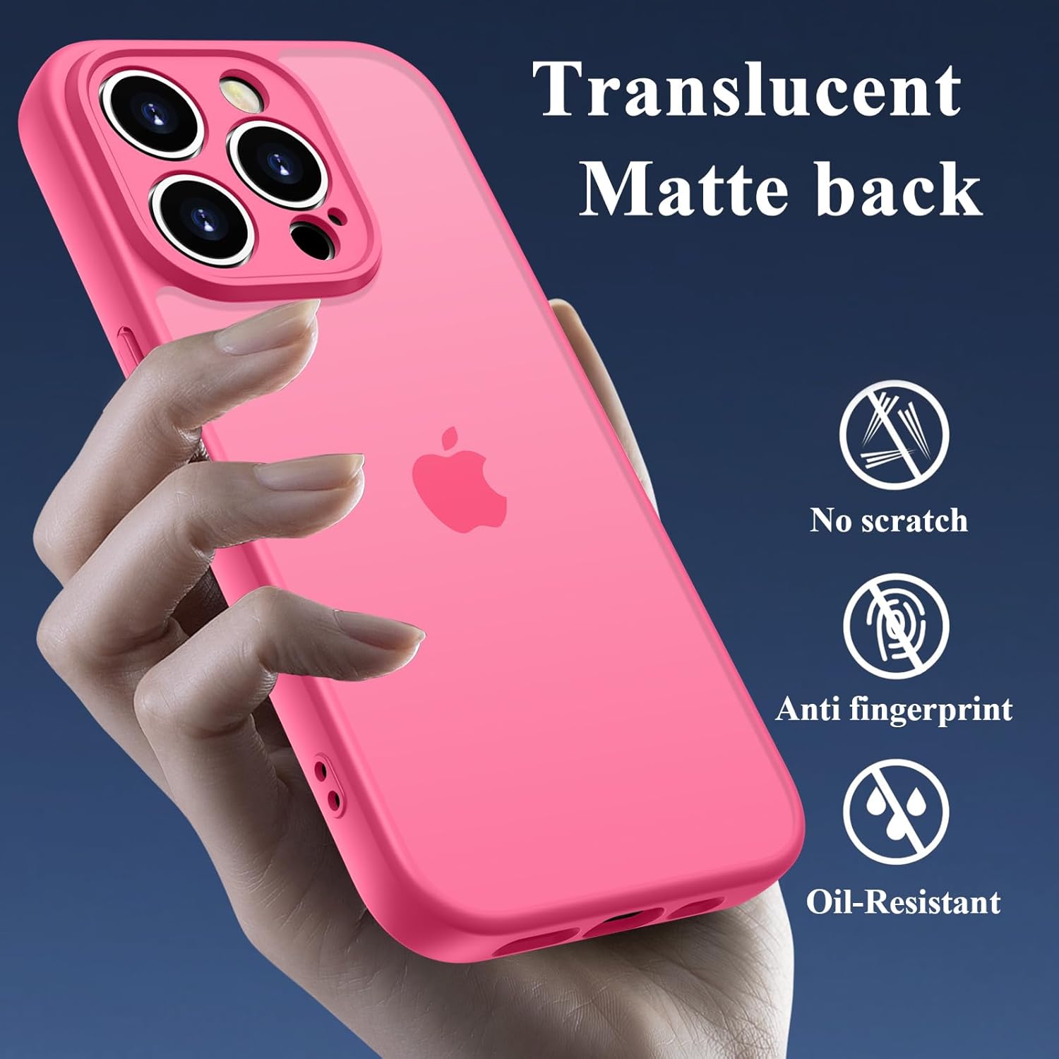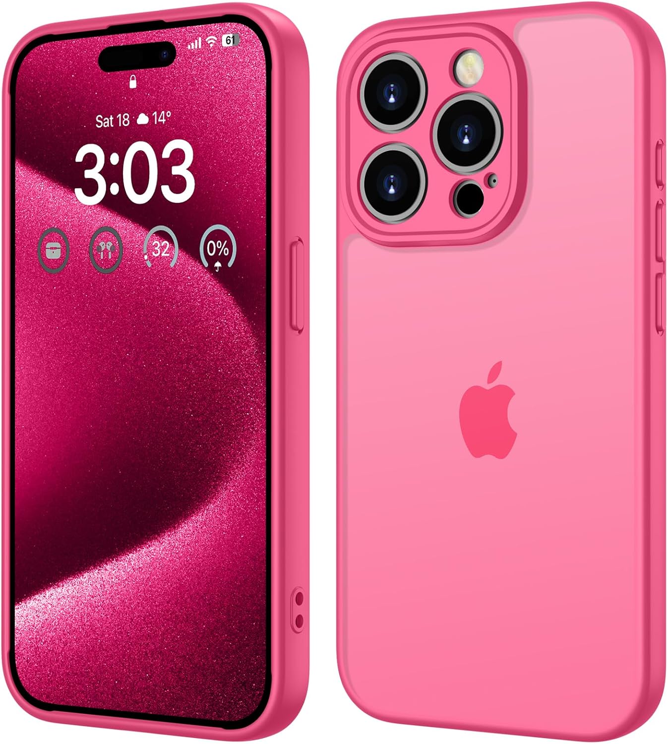 ORDA Кейс за iPhone 15 Pro, 6.1 инча, пълна защита на камерата, удароустойчив, устойчив на надраскване, прозрачен защитен калъф за гръб, матов калъф за мобилен телефон против пръстови отпечатъци за iPhone 15 Pro (ярко розов)