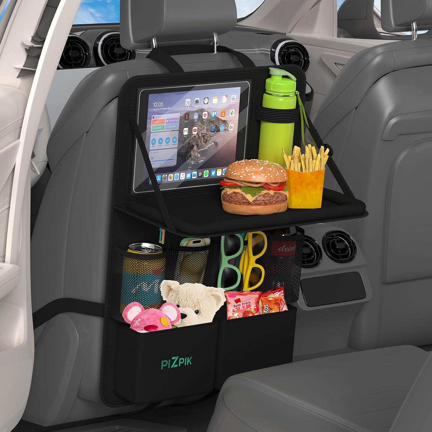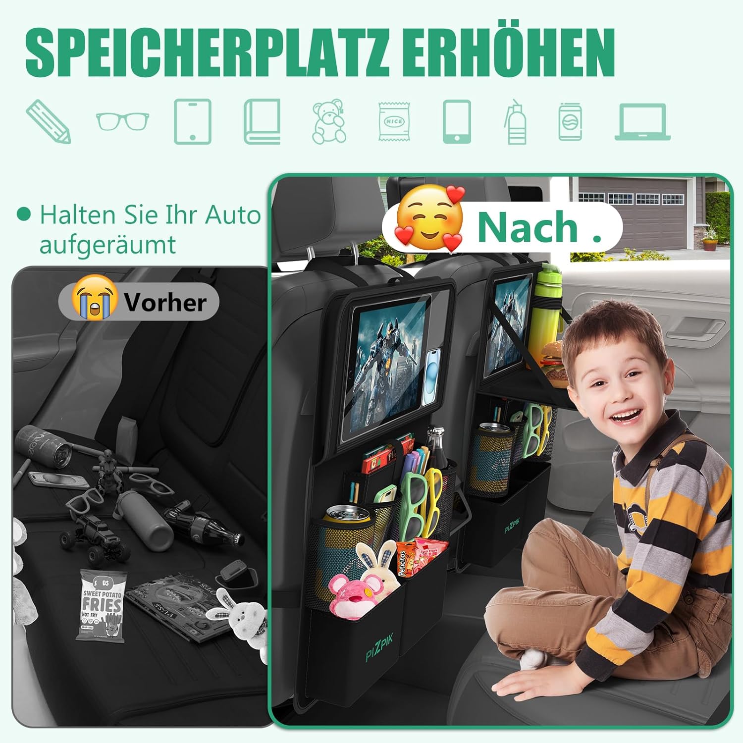 • Изключително голям капацитет за съхранение: Има 13 места за съхранение, включително 1 сгъваема тава и 12 джоба с различни размери и видове. Предлага ви повече място за съхранение. Може да се управлява от сензорния екран чрез прозрачния сензорен джоб, подходящ за повечето мобилни телефони и малки таблети. Нашият детски органайзер за кола може да съхранява книги, химикалки, детски играчки, чаши, таблети и много други, осигурявайки ви подредена и просторна среда в колата.