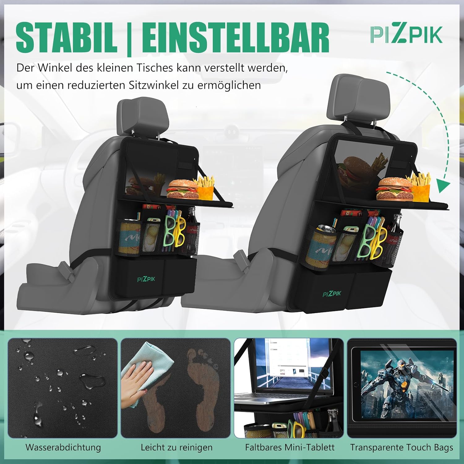 • Лесен монтаж: нашите протектори за облегалките на детските седалки са подходящи за повечето автомобили и SUV-ове и могат да се монтират за по-малко от 5 минути. С изключение на автомобили с вградени възглавници и облегалки. Плотът на масата може да се регулира под всякакъв ъгъл, за да се поддържа баланс. Децата могат да виждат и докосват таблети по-добре, да играят с играчки и много други. Размер на органайзера за детски седалки: 42 см x 63 см.